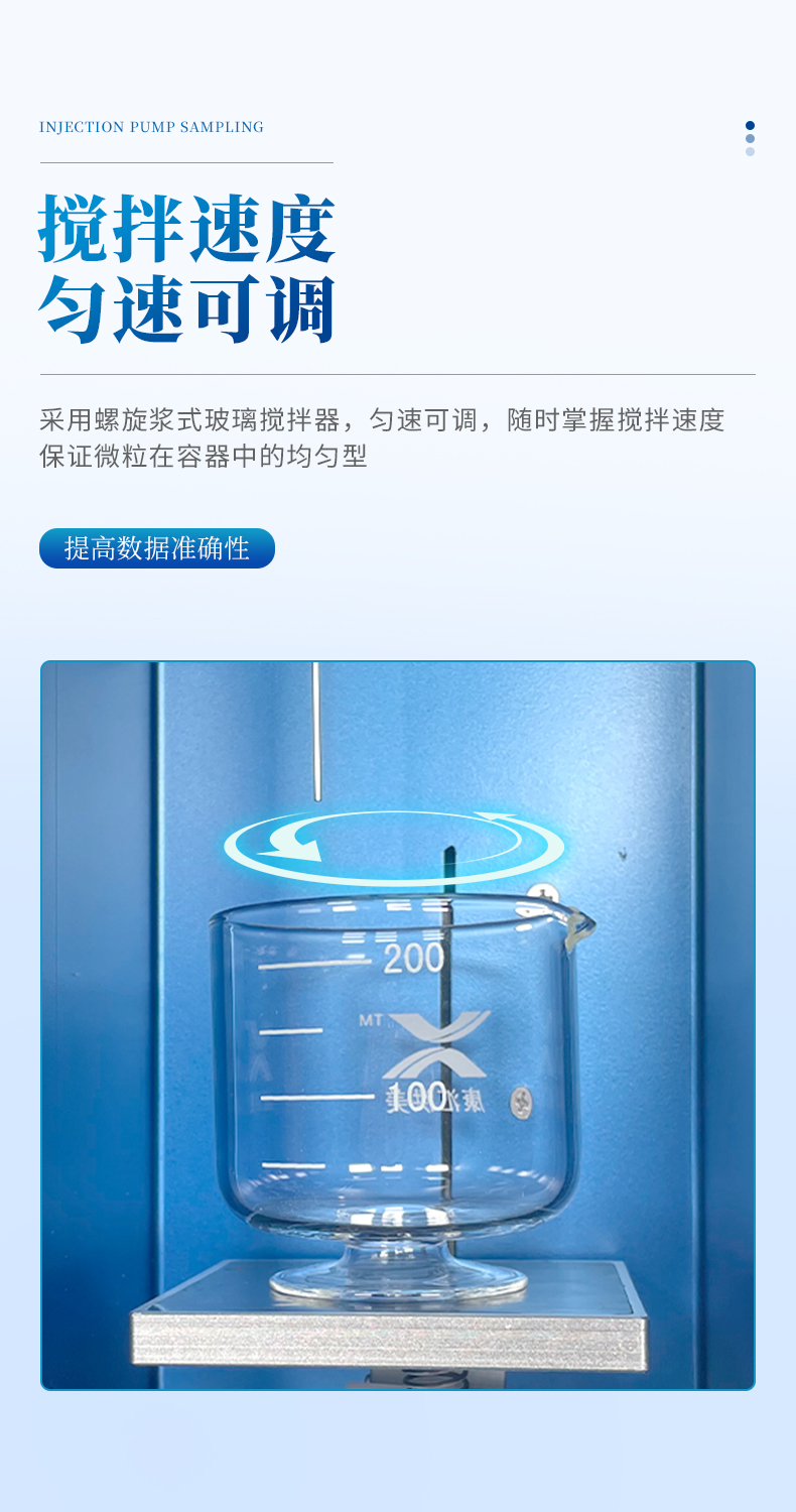 ●采用螺旋漿式玻璃攪拌器,勻速可調(diào),隨時掌握攪拌速度,保證微粒在容器中的均勻型。提高數(shù)據(jù)準(zhǔn)確性
