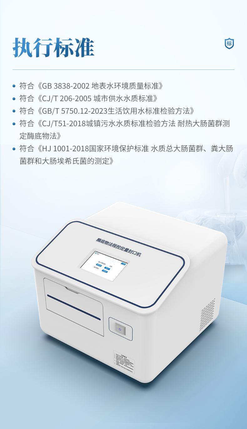 酶底物法檢測裝置由程控定量封口機、51 或 97 孔定量檢測盤、100mL定量瓶、酶底物法檢測試劑四部分組成,檢測水樣范圍:飲用水、源水、瓶裝水、中水、二次供水、管網水、廢水、食品水、畜牧用水、醫療用水等。