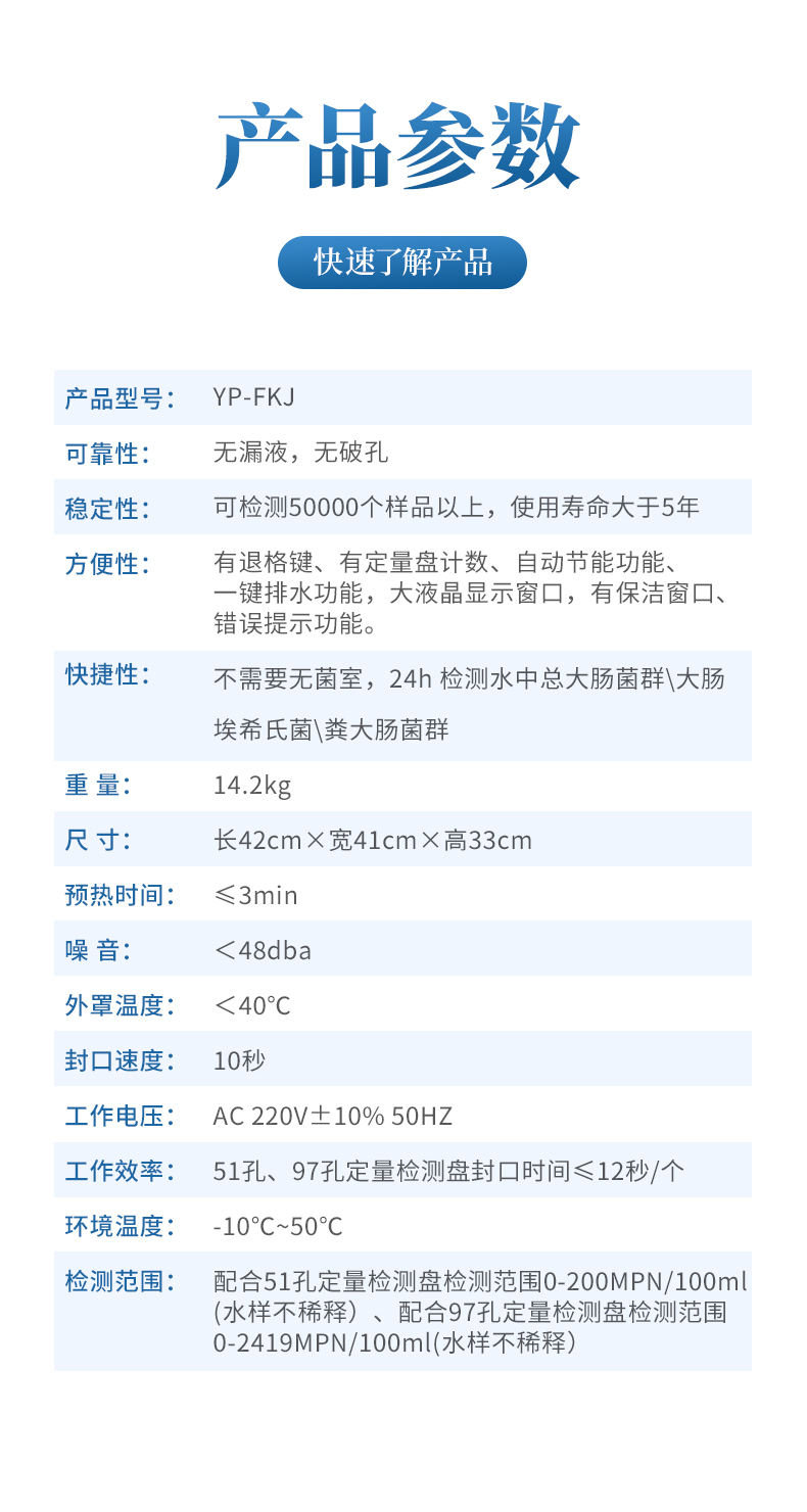 檢測范圍:配合51孔定量檢測盤檢測范圍0-200MPN/100ml (水樣不稀釋)、配合97孔定量檢測盤檢測范圍0-2419MPN/100ml(水樣不稀釋)