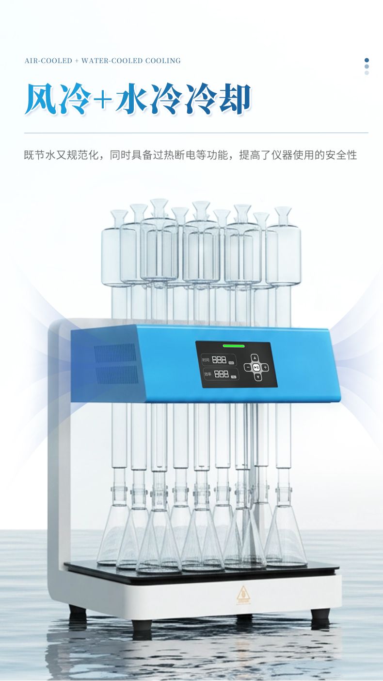3. 安全性能優(yōu):采用玻璃毛刺回流管代替球形回流管,并以風(fēng)冷+水冷技術(shù)取代傳統(tǒng)自來水冷卻方式,既可以節(jié)水又能使儀器規(guī)范化,同時(shí)具備過熱斷電等功能,提高了儀器使用的安全性。 4.面板易清潔:采用石墨烯加熱板,表面光滑、平整,表面污漬一擦即凈,可減少操作不當(dāng)對儀器的損壞;