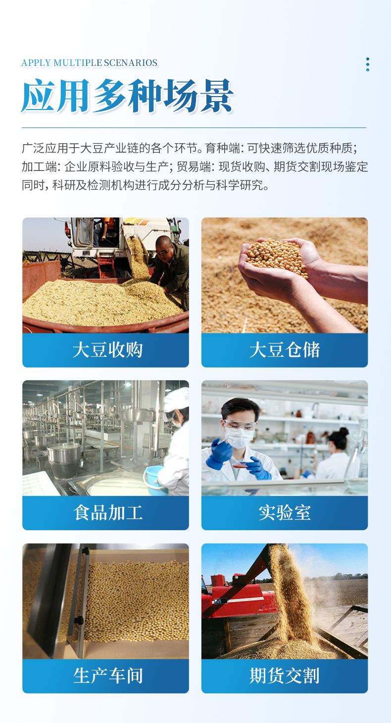 本儀器廣泛應用于大豆產業鏈的各個環節,為品質管控與價值評估提供高效解決方案。在育種端,可快速篩選優質種質資源;在加工端,服務于油脂、食品及飼料企業的原料驗收與生產過程控制環節;在貿易端,為現貨收購、期貨交割實現現場快速定價與品質鑒定。同時,它也是科研及檢測機構進行成分分析與科學研究的得力工具,全面覆蓋從田間到車間的精準檢測需求。