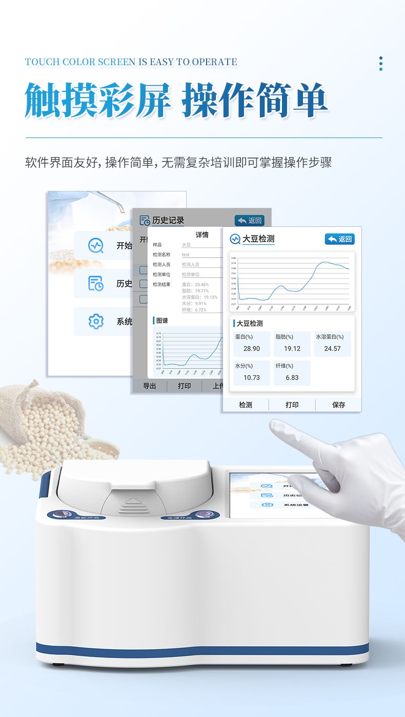 便攜式近紅外大豆蛋白儀采用先進的近紅外光譜技術,可同時無損檢測大豆中的蛋白質、脂肪、水溶性蛋白、干基蛋白、纖維和水分等指標。分析過程無需復雜前處理,數十秒內即可得出結果,極大提升了檢測效率,降低了時間和人力成本。該儀器操作智能簡便,結果穩定可靠,是糧油加工、食品檢測、育種研發和貿易收購等領域進行原料驗收、過程控制與品質評定的理想工具。