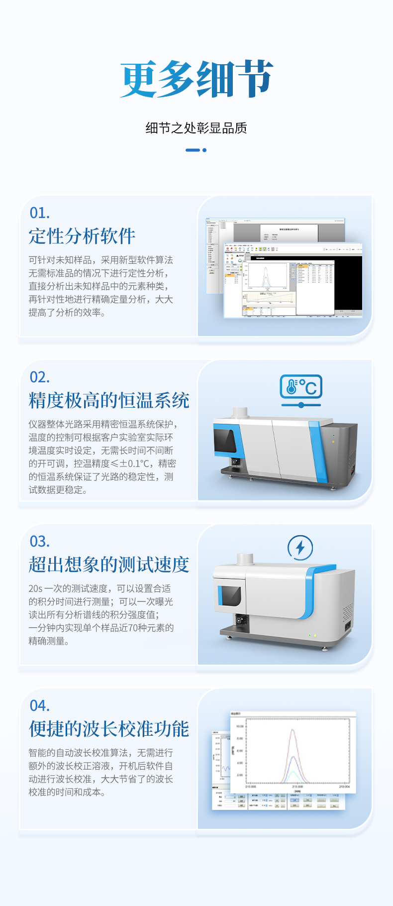 儀器整體光路采用精密恒溫系統(tǒng)保護,溫度的控制可根據客戶實驗室實際環(huán)境溫度實時設定,無需長時間不間斷的開可調,控溫精度≤±0.1℃,精密的恒溫系統(tǒng)保證了光路的穩(wěn)定性,測試數據更穩(wěn)定。