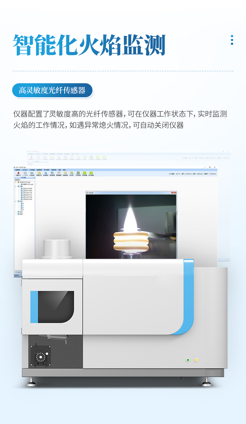 儀器配置了靈敏度*的光纖傳感器,可在儀器工作狀態(tài)下,實時監(jiān)測火焰的工作情況,如遇異常熄火情況,可自動關閉儀器。