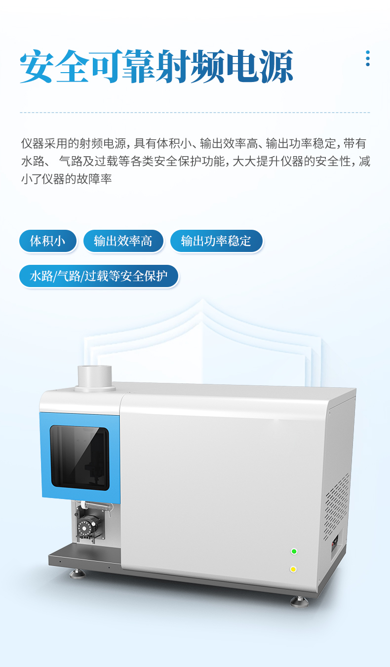 儀器采用的射頻電源,具有體積小、輸出效率高、輸出功率穩(wěn)定,帶有水路、氣路及過載等各類安全保護功能,大大提升儀器的安全性,減小了儀器的故障率。