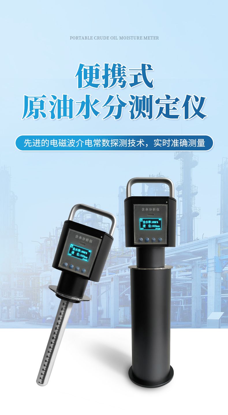 便攜式原油含水測定儀采用了先進的電磁波介電常數探測技術及德國專用芯片,使該儀表具有智能化、小型化的特點。實現了原油含水率實時準確測量,打破了外國公司對該產品的技術和價格壟斷。該產品專門針對我國原油粘稠度高、高含水、高含蠟的特點設計獨特的探測頭和分體結構,采用了各項工藝措施,完全適應我國各大油田的原油含水率的化驗測量。傳感器探頭采用 3特氟龍材料制作,耐高溫、酸、堿、硫化氣體的腐蝕,不易結垢、結蠟,從而保證了儀表測量數據的準確性和穩定性,可廣泛使用于我國各大油田的化驗室。