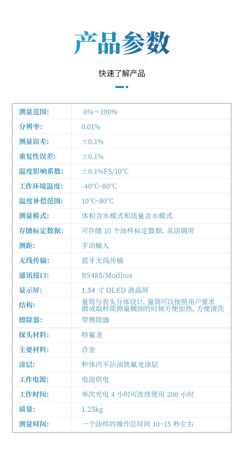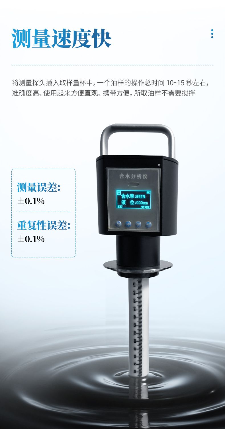 1、測量稀油的時候 10 秒就可以看結果,測量稠油時,如果是低含水 30%以下時間一般也是 10 秒左右,如果是高含水的話,測量時間盡量長一點,按實驗數據看一般 1-2 分鐘左右,具體多長時間要根據現場稠油的粘度來定。