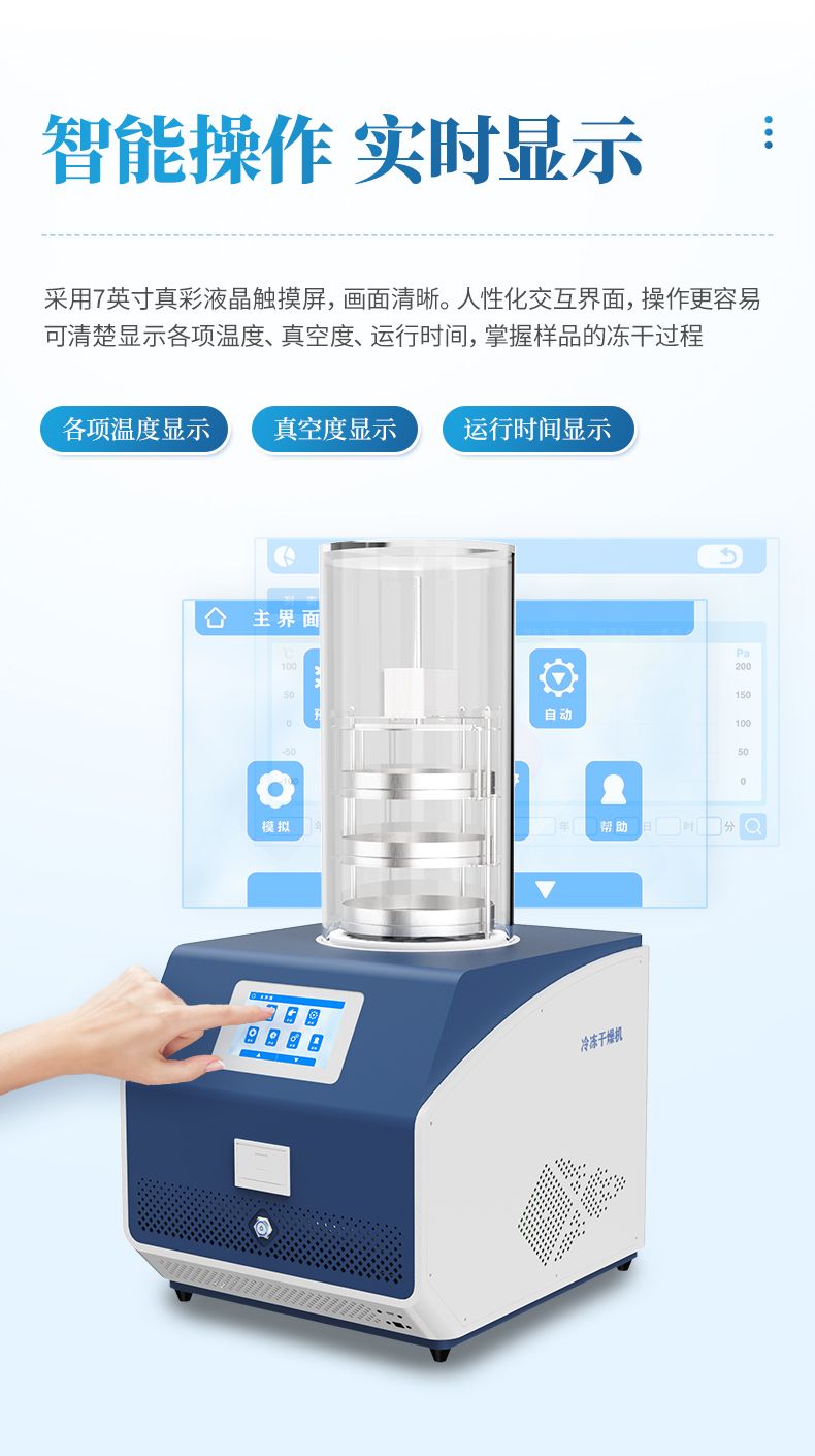 (2) 可清楚顯示各項(xiàng)溫度、真空度、運(yùn)行時(shí)間,掌握樣品的凍干過(guò)程。