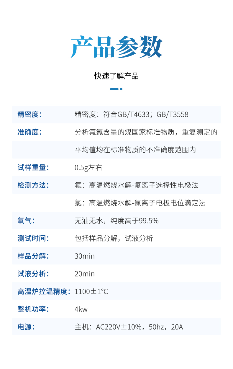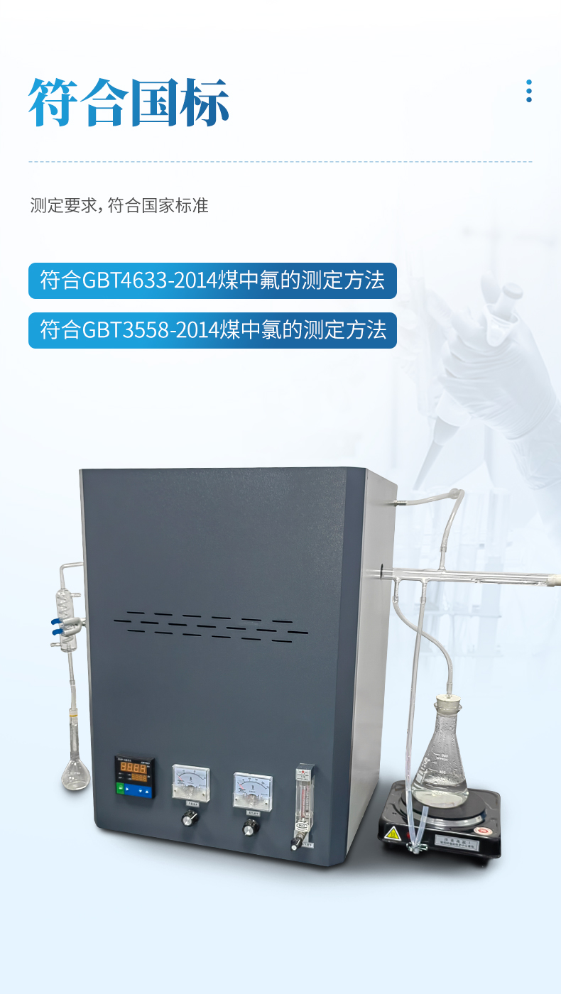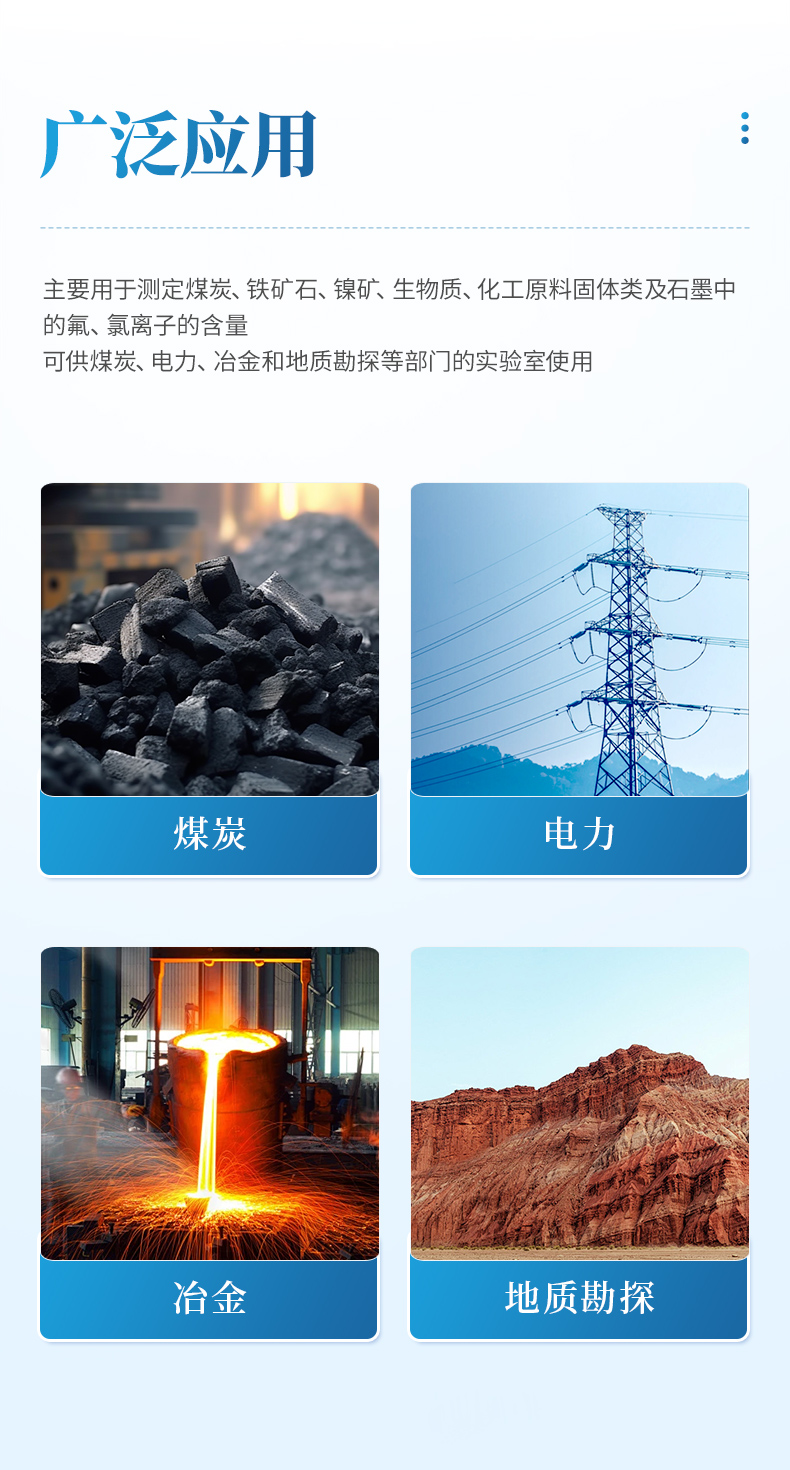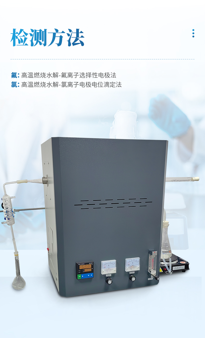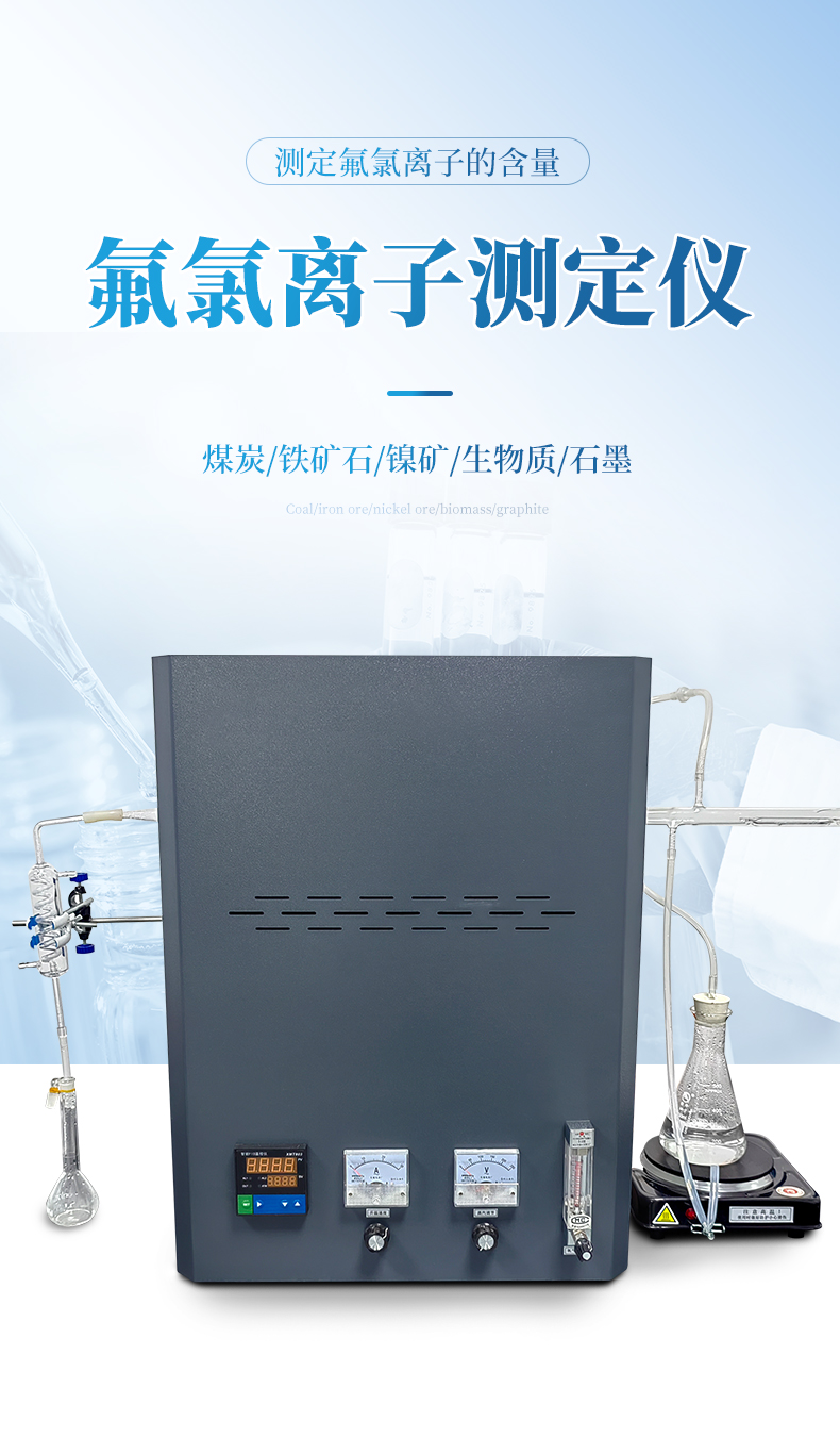 氟氯離子測定儀(高溫燃燒水解裝置、氟氯離子計、氟氯電極)主要用于測定煤炭、鐵礦石、鎳礦、生物質、化工原料固體類及石墨中的氟、氯離子的含量,符合GBT4633-2014煤中氟的測定方法、GBT3558-2014煤中氯的測定方法國家標準要求。檢測原理:利用高溫燃燒水解—氟/氯離子選擇性電極法測定煤中總氟、氯含量。可供煤炭、電力、冶金和地質勘探等部門的實驗室使用。