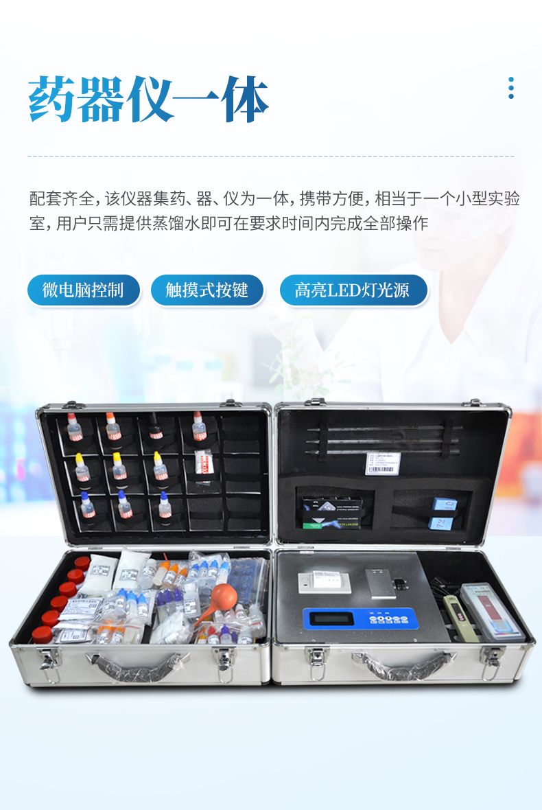 配套齊全,該儀器集藥、器、儀為一體,攜帶方便,相當于一個小型實驗室,用戶只需提供蒸餾水即可在要求時間內完成全部操作。