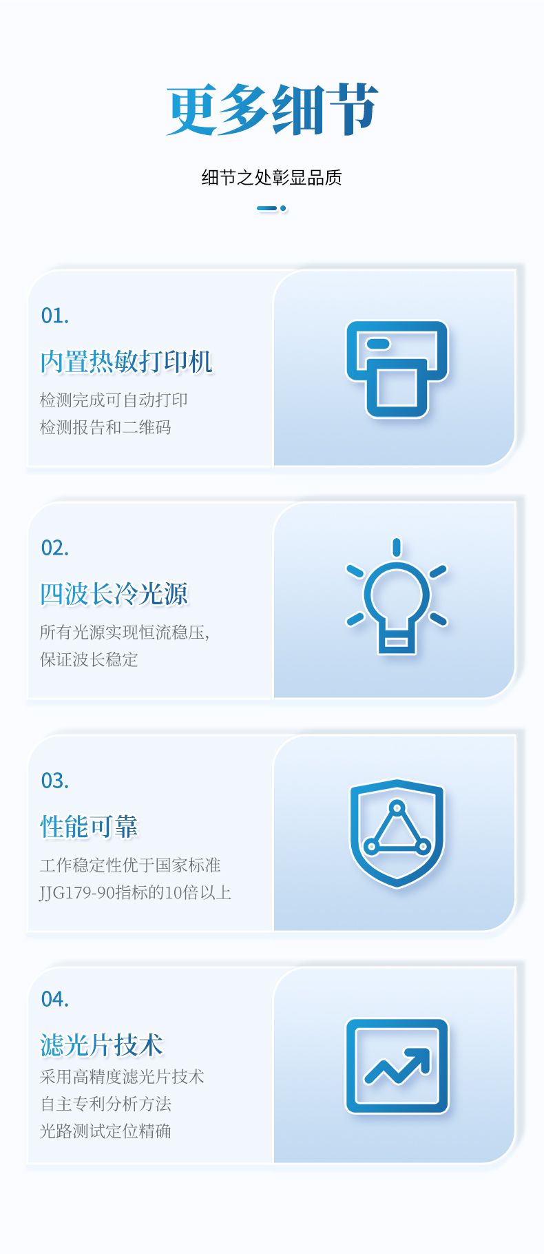 ★獨家采用高亮LED燈光源、雙撥輪濾光式處理技術,保證光源波長穩定, 硅半導體作為信號接收系統, 壽命長達10萬小時級別。光源穩定,重現性好,準確度高。