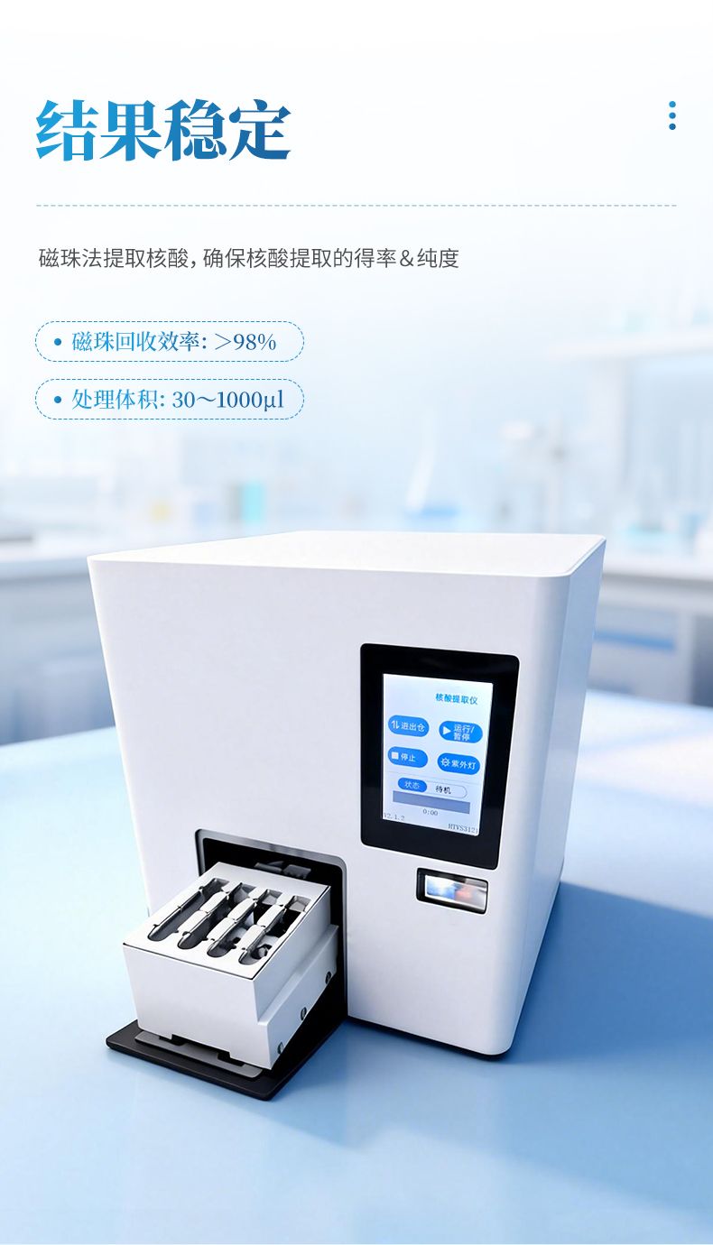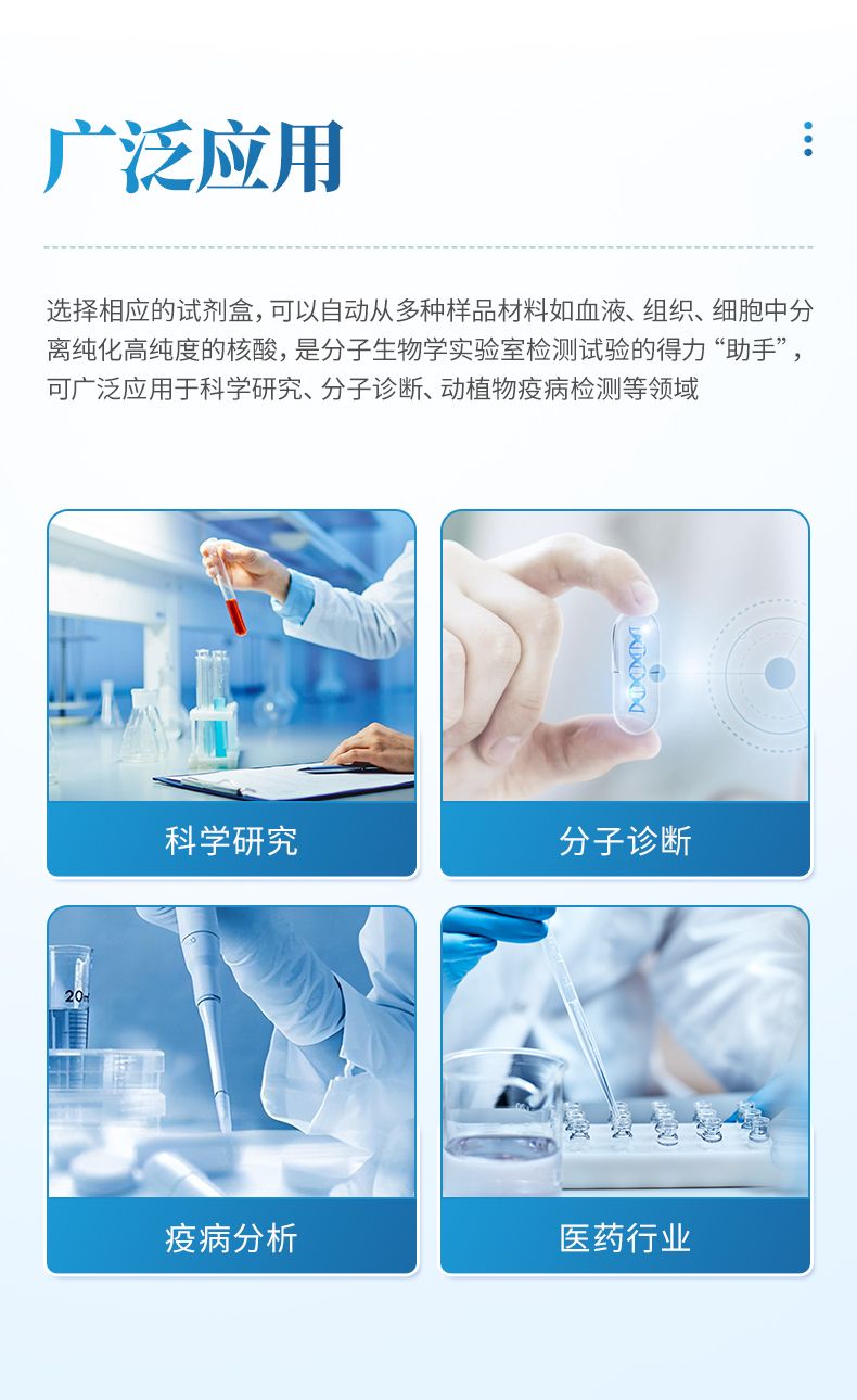 核酸提取儀通過磁珠法提取核酸,選擇相應(yīng)的試劑盒就可以自動(dòng)的從多種樣品材料如血液、組織、細(xì)胞中分離純化高純度的核酸。具有兼容性強(qiáng)(適配預(yù)封裝提取試劑盒,也可適配單頭份試劑)、提取速度快、提取回收率高、操作簡(jiǎn)便的優(yōu)點(diǎn),是分子生物學(xué)實(shí)驗(yàn)室檢測(cè)試驗(yàn)的得力“助手”。可廣泛應(yīng)用于科學(xué)研究、分子診斷、動(dòng)植物疫病檢測(cè)等領(lǐng)域。
