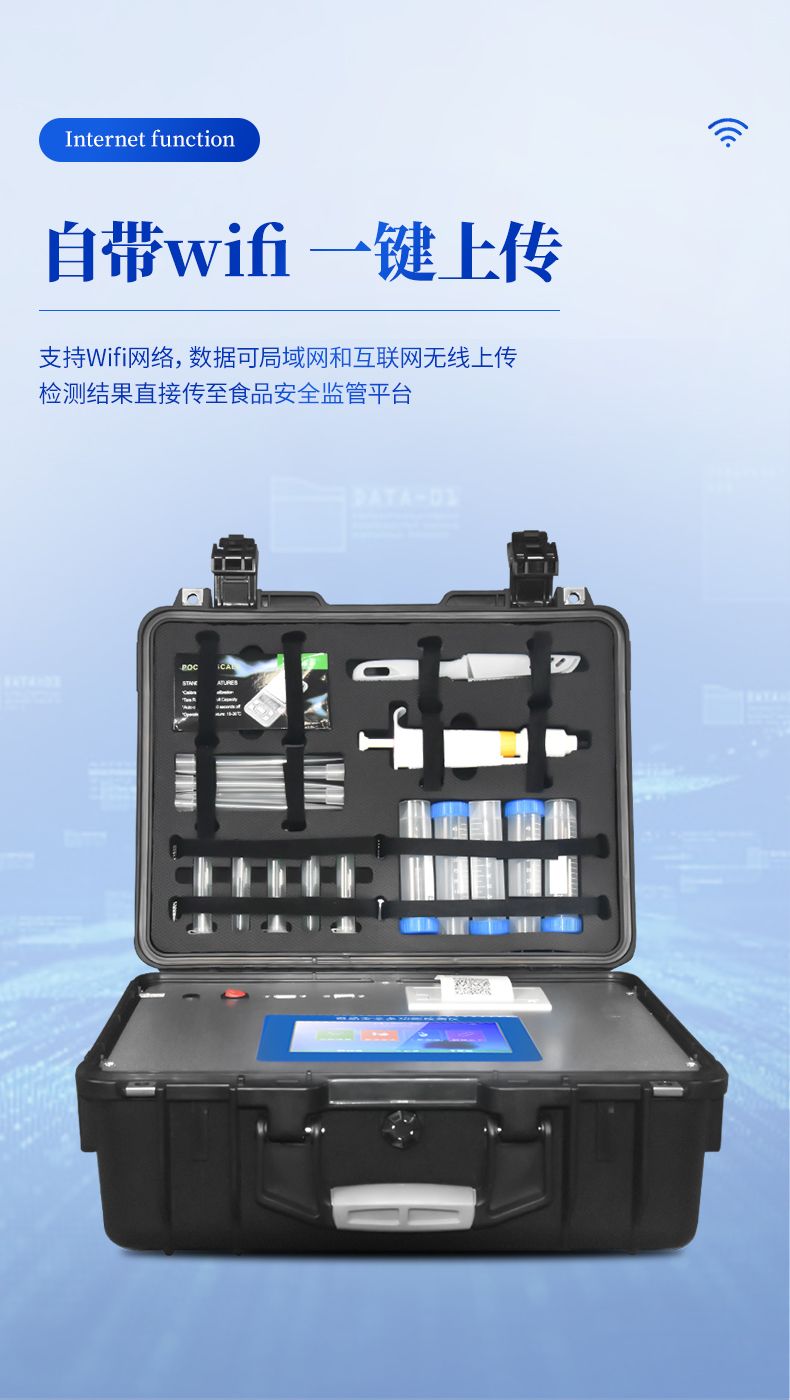 13、支持Wifi網絡,數據可局域網和互聯網無線上傳,檢測結果直接傳至食品安全監管平臺。進行區域食品安全監管及大數據分析處理,檢測區域食品安全長短期動態,達到食品安全問題預估、預警。