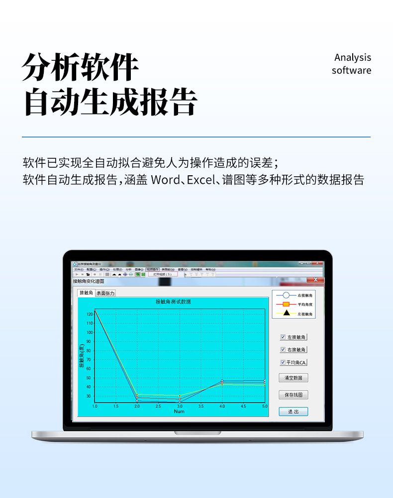 6.分析軟件功能強(qiáng)大:具備一鍵式全自動(dòng)擬合能力,具備國際最領(lǐng)先的擬合方法,滿足各種液滴形態(tài)的精確擬合;