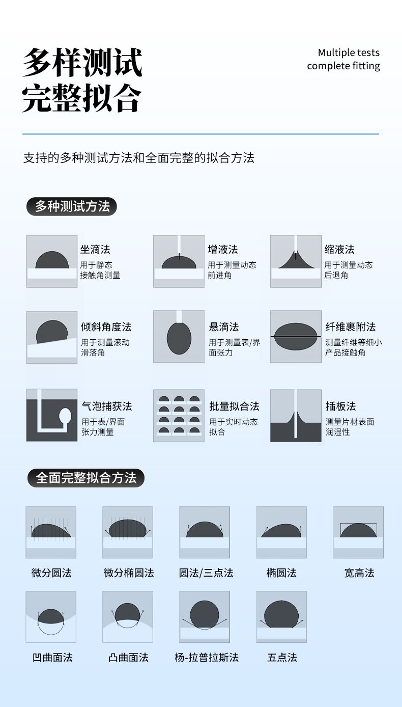 | 動態(tài)接觸角擬合 | 批量截圖擬合、視頻連續(xù)自動擬合、自動在線實時擬合 |
