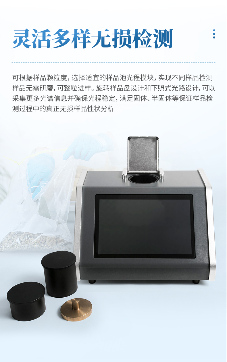 2.、旋轉樣品盤設計和下照式光路設計,可以采集更多光譜信息并確保光程穩定,滿足固體、半固體等保證樣品檢測過程中的真正無損樣品性狀分析。