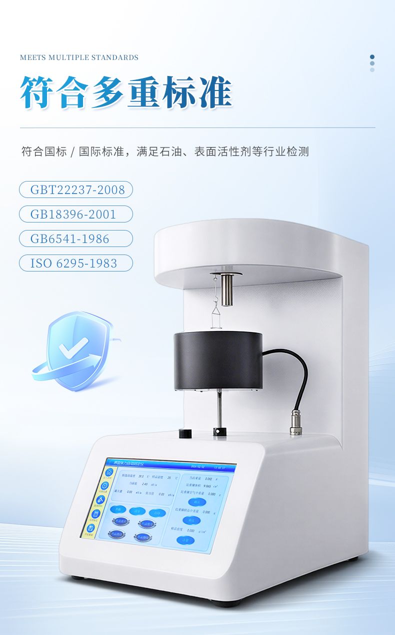 本儀器是一款用于測定表面張力、界面張力及液體密度的專用檢測設備,嚴格符合多項國家及國際標準要求,可廣泛應用于石油產品、表面活性劑、天然膠乳等各類樣品的相關指標檢測。具體符合標準包括:GB6541-1986《石油產品油對水界面張力測定法》(圓環法)、GB/T22237-2008《表面活性劑 表面張力的測定》、GB18396-2001《天然膠乳 環法測定表面張力》、ISO 6295-1983《石油產品、礦物質潤滑油 油對水的界面張力的測定 圓環法》等。
