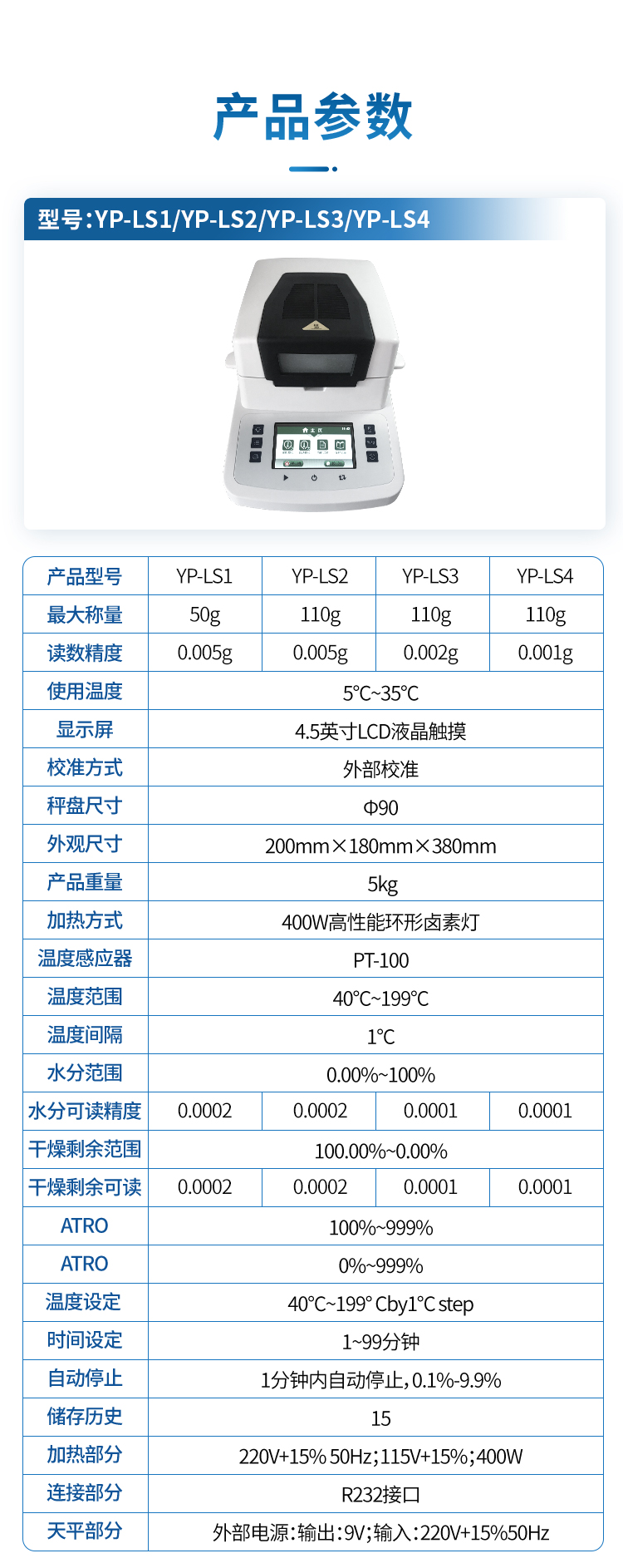 | 水分可讀精度 Moisturereadability | 0.0002 | 0.0002 | 0.0001 | 0.0001 |