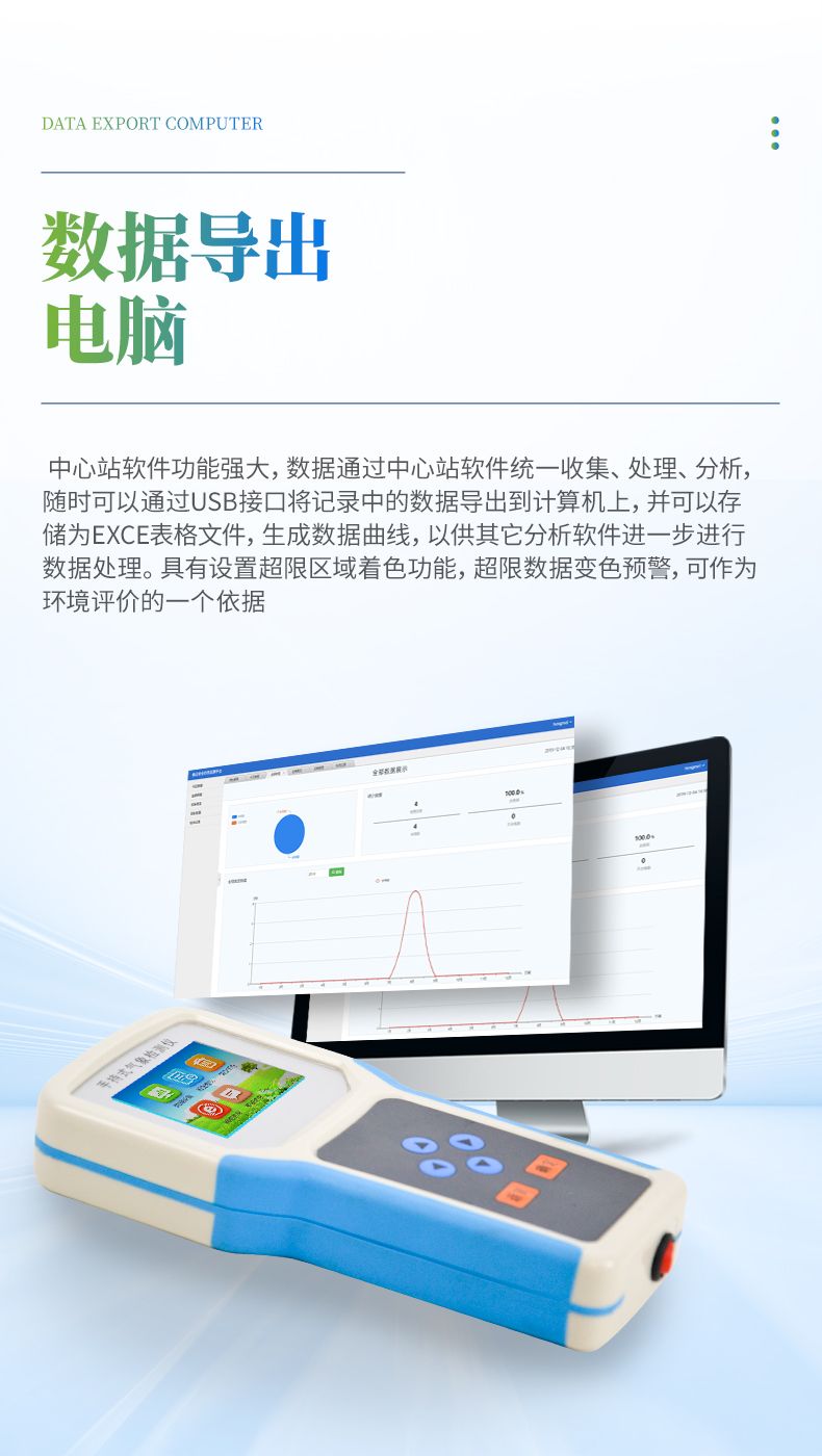 .中心站軟件功能強大,數據通過中心站軟件統一收集、處理、分析,隨時可以通過USB接口將記錄中的數據導出到計算機上,并可以存儲為EXCE表格文件,生成數據曲線,以供其它分析軟件進一步進行數據處理。具有設置超限區域著色功能,超限數據變色預警,可作為環境評價的一個依據。