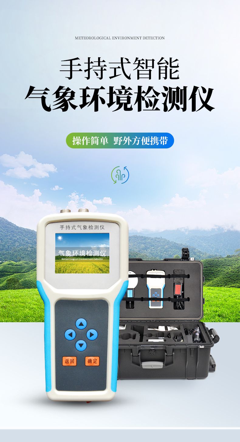 手持式智能農業氣象環境檢測儀是我們專門針對農田、草場局部小尺度環境設計的,對與植被和農作物生長密切相關的土壤、水氣等環境參數監測的農田小氣候站。它主要觀測與農業相關的空氣溫度、空氣濕度、光照強度、二氧化碳濃度等4個環境參數氣象要素,為農業科研、農業生產等提供良好的支持。