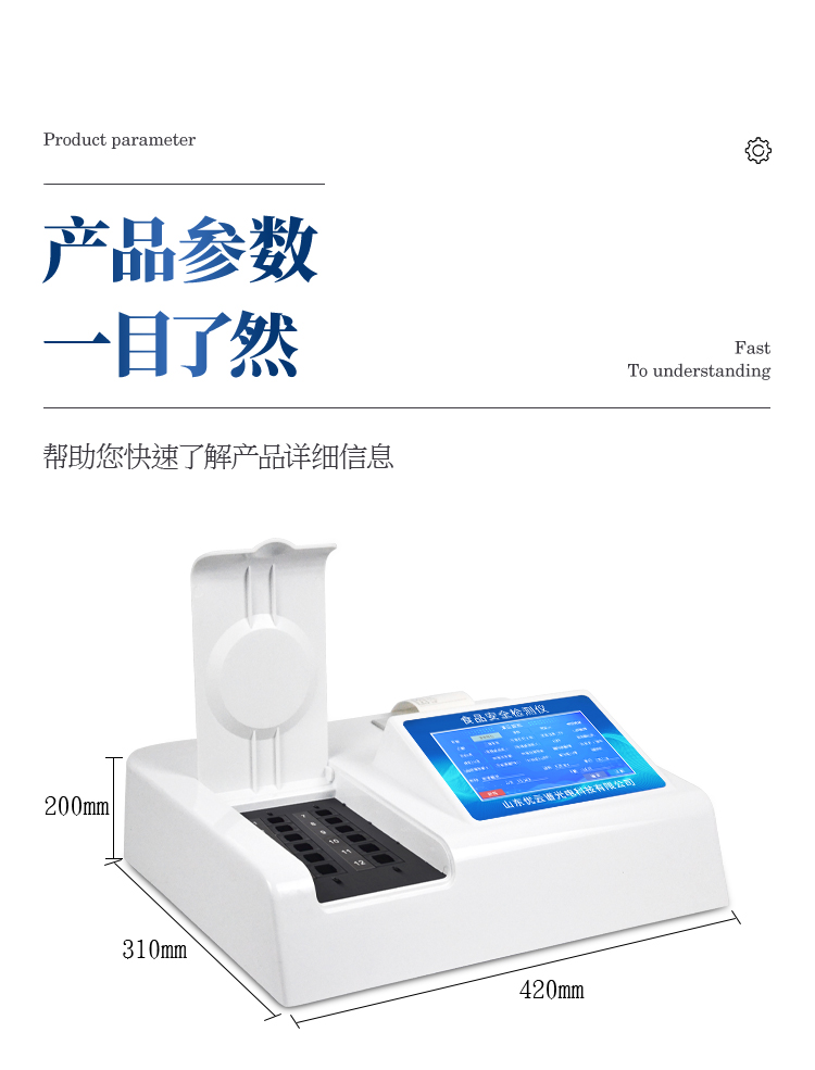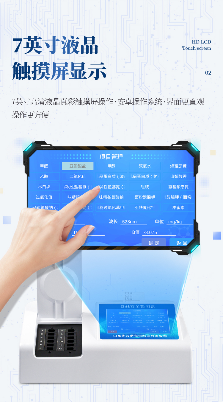 可快速檢測(cè)各類食品中的甲醛、吊白塊、二氧化硫、亞硝酸鹽、雙氧水、硼砂、農(nóng)藥殘留、乳及乳制品中蛋白質(zhì)的含量,儀器預(yù)留其他項(xiàng)目檢測(cè)程序和端口,根據(jù)日后需求可方便的自主增加檢測(cè)項(xiàng)目。