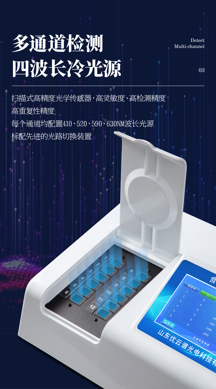 3、四波長(zhǎng)冷光源,每個(gè)通道均配置410、520、590、630nm波長(zhǎng)光源,標(biāo)配先進(jìn)的光路切換裝置,專利光路切換功能可實(shí)現(xiàn)最多64波長(zhǎng),并且所有檢測(cè)項(xiàng)目可實(shí)現(xiàn)所有通道同時(shí)檢測(cè)。