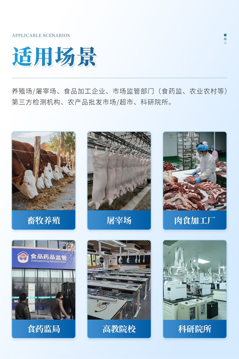 主要應用場景:養殖場/屠宰場、食品加工企業、市場監管部門(食藥監、農業農村部等)、第三方檢測機構、農產品批發市場/超市、科研院所。