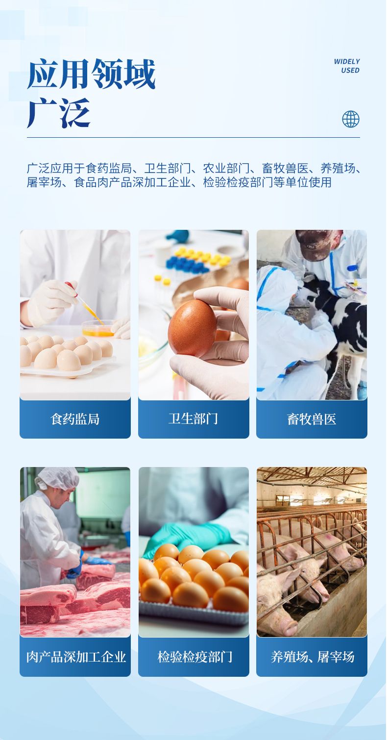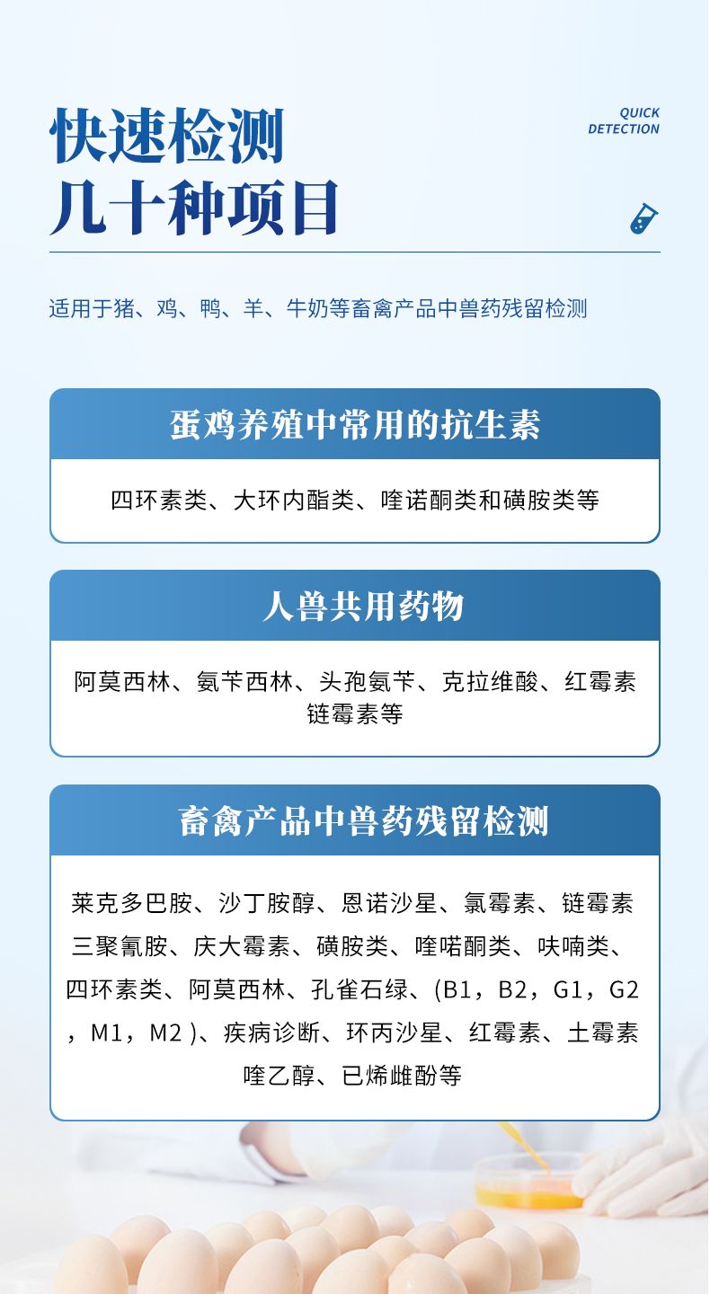 雞蛋抗生素檢測儀可適用于豬、雞、鴨、羊、牛奶等畜禽產品中獸藥殘留檢測,如、萊克多巴胺、沙丁胺醇、恩諾沙星、氯霉素、鏈霉素、三聚氰胺、慶大霉素、磺胺類、喹喏酮類、呋喃類、四環素類、阿莫西林、孔雀石綠、(B1,B2,G1,G2,M1,M2 )、疾病診斷、環丙沙星、紅霉素、土霉素、喹乙醇、已烯雌酚等。并廣泛應用于廣泛應用于食藥監局、衛生部門、農業部門、畜牧獸醫、養殖場、屠宰場、食品肉產品深加工企業、檢驗檢疫部門等單位使用。