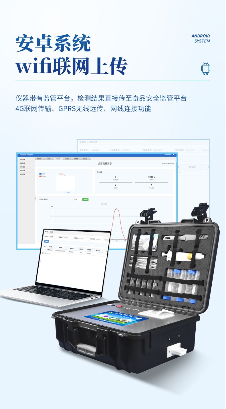 4、儀器帶有監管平臺,數據可局域網和互聯網數據上傳,檢測結果直接傳至食品安全監管平臺。進行區域食品安全監管及大數據分析處理與數據統計,檢測區域食品安全長短期動態,達到食品安全問題預估、預警