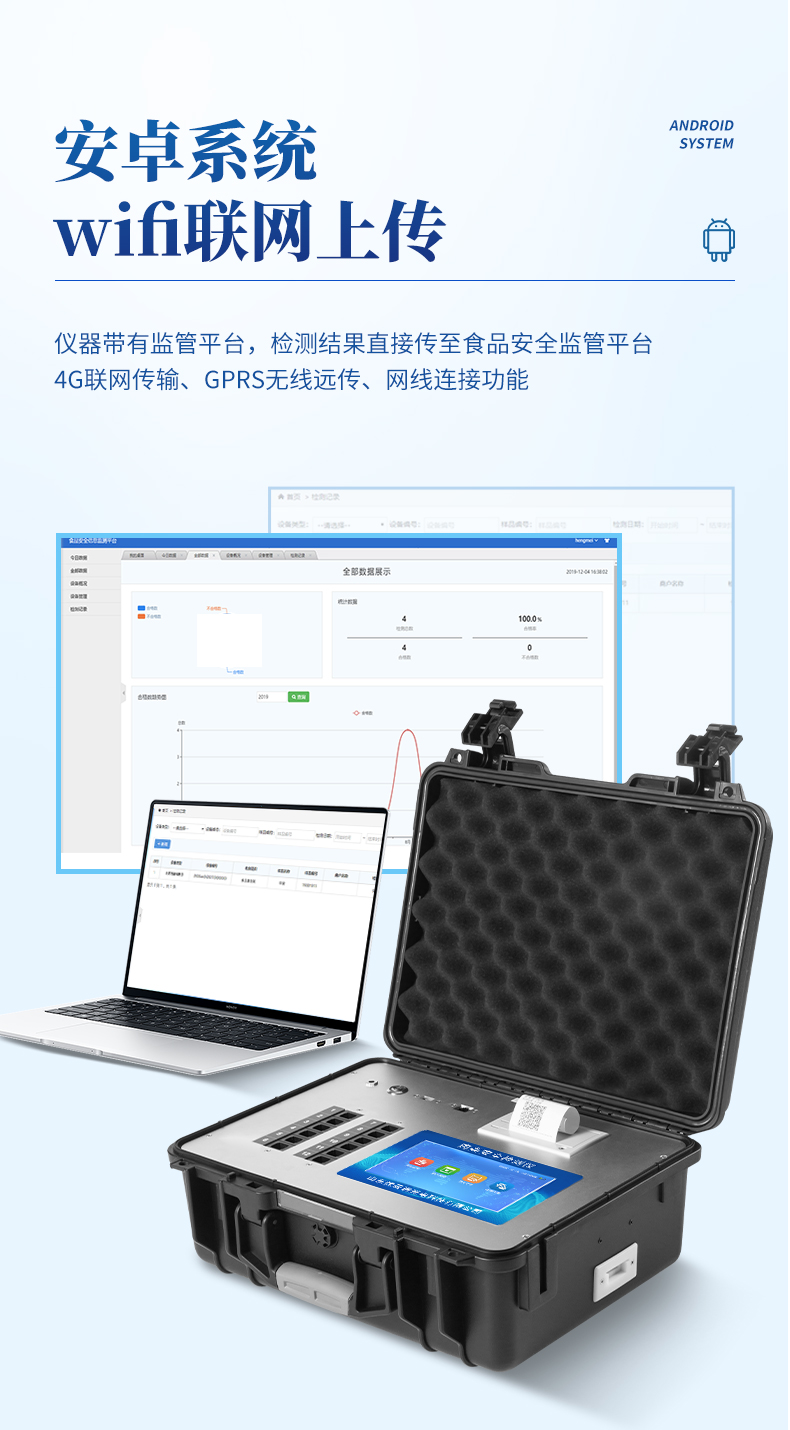 4、儀器帶有監(jiān)管平臺,數(shù)據(jù)可局域網(wǎng)和互聯(lián)網(wǎng)數(shù)據(jù)上傳,檢測結(jié)果直接傳至食品安全監(jiān)管平臺。進行區(qū)域食品安全監(jiān)管及大數(shù)據(jù)分析處理與數(shù)據(jù)統(tǒng)計,檢測區(qū)域食品安全長短期動態(tài),達到食品安全問題預估、預警