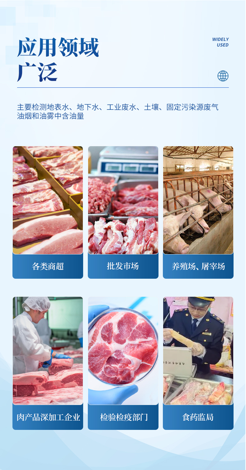 該多功能肉類檢測儀為集成化肉品安全快速檢測分析設備,廣泛應用于養(yǎng)殖場、屠宰場、食品肉產(chǎn)品深加工企業(yè)、檢驗檢疫部門、食藥監(jiān)局、衛(wèi)生部門、高教院校、科研院所、農(nóng)業(yè)部門等單位使用。