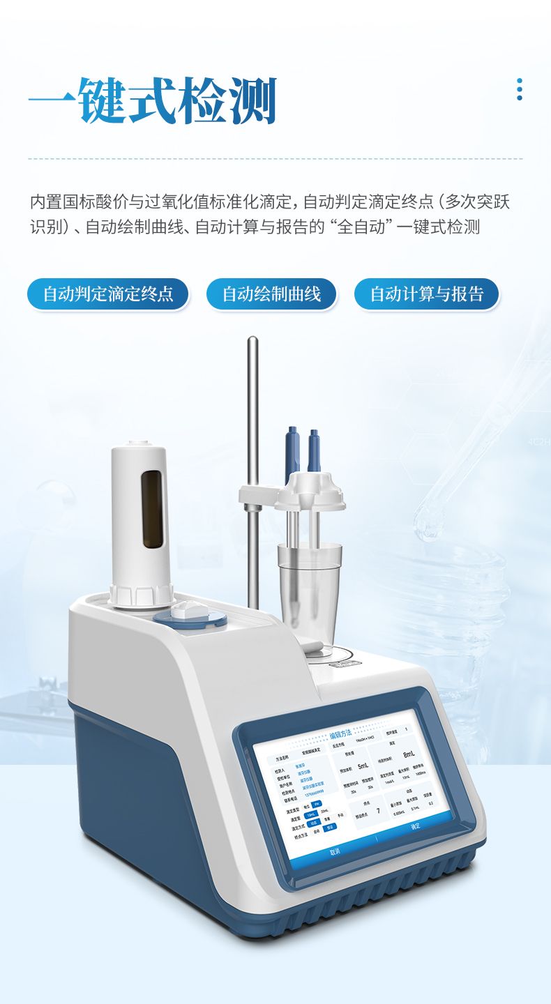 3.內(nèi)置國標酸價與過氧化值標準化滴定,自動判定滴定終點(多次突躍識別)、自動繪制曲線、自動計算與報告的“全自動”一鍵式檢測;