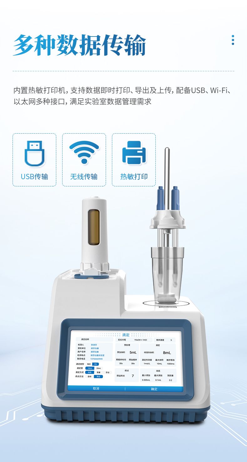 7.大容量本地存儲器,完整保存檢測數(shù)據(jù)及滴定曲線,內(nèi)置熱敏打印機可即時打印檢測數(shù)據(jù);