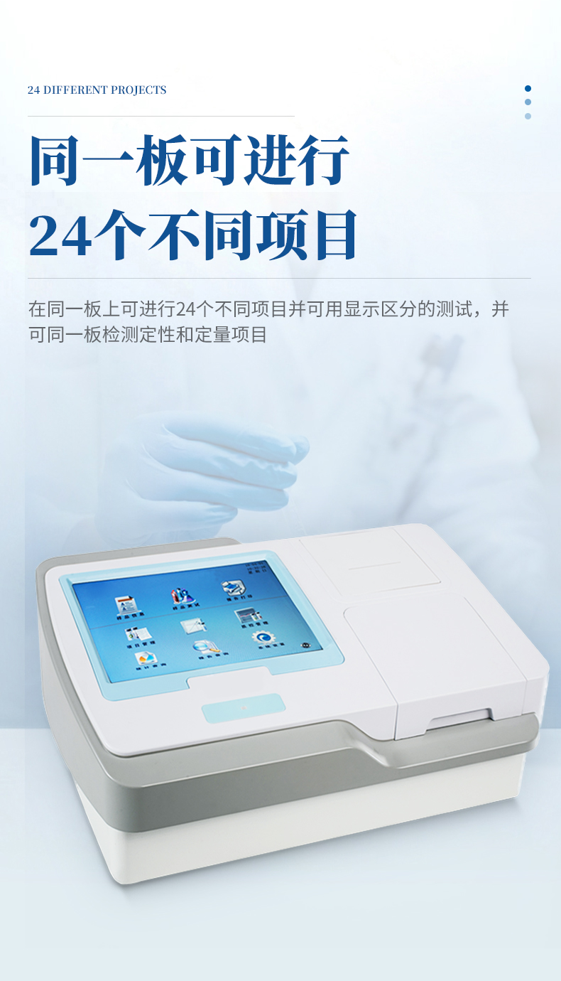 *在同一板上可進(jìn)行24個(gè)不同項(xiàng)目并可用顯示區(qū)分的測(cè)試,并可同一板檢測(cè)定性和定量項(xiàng)目;