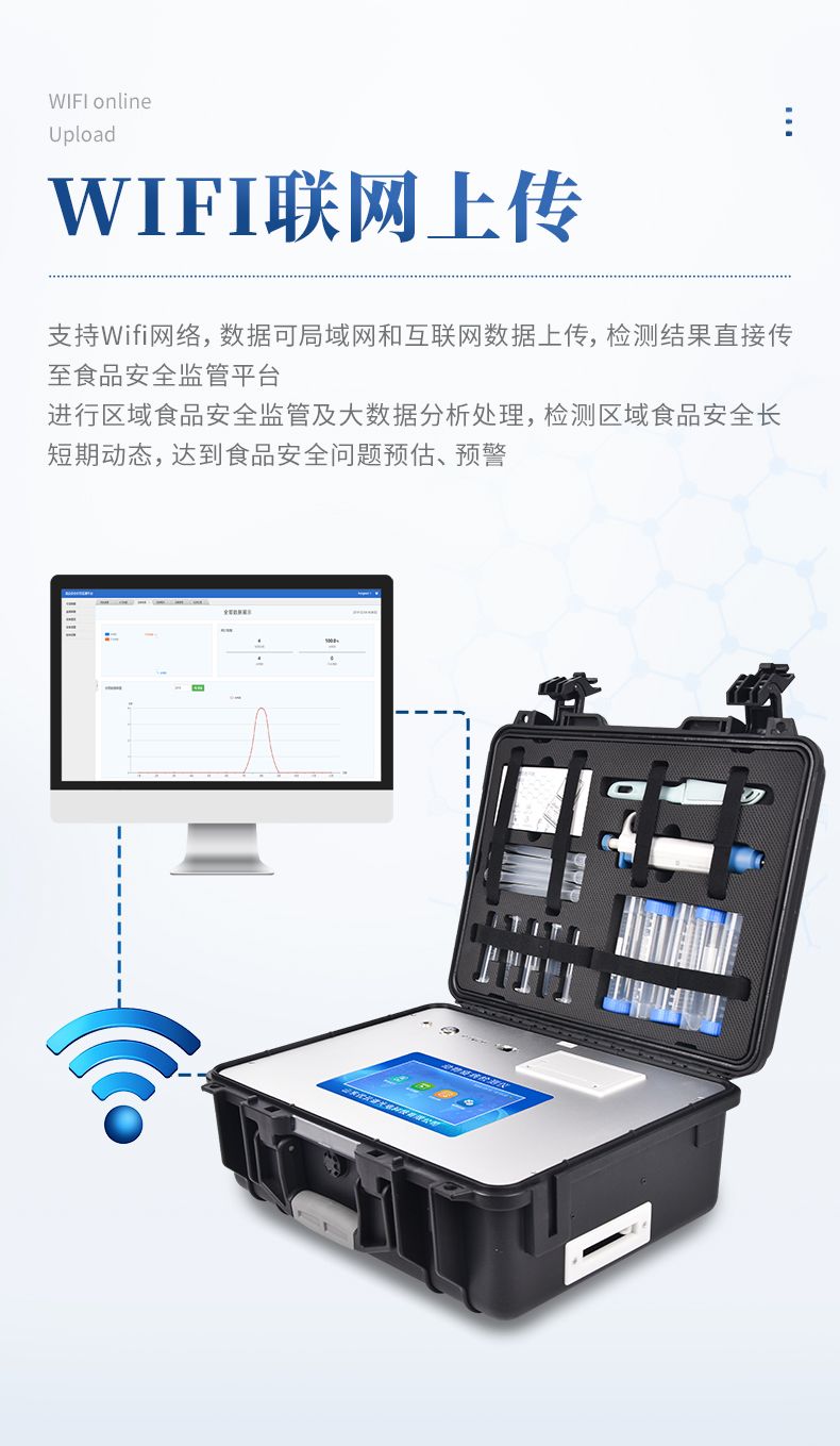 13、支持Wifi網絡,數據可局域網和互聯網數據上傳,檢測結果直接傳至食品安全監管平臺。進行區域食品安全監管及大數據分析處理,檢測區域食品安全長短期動態,達到食品安全問題預估、預警