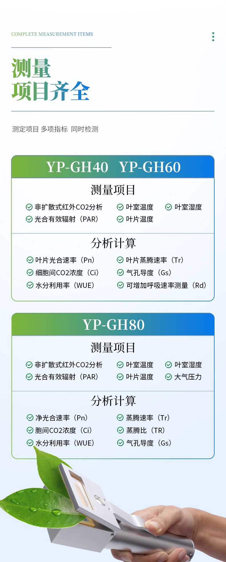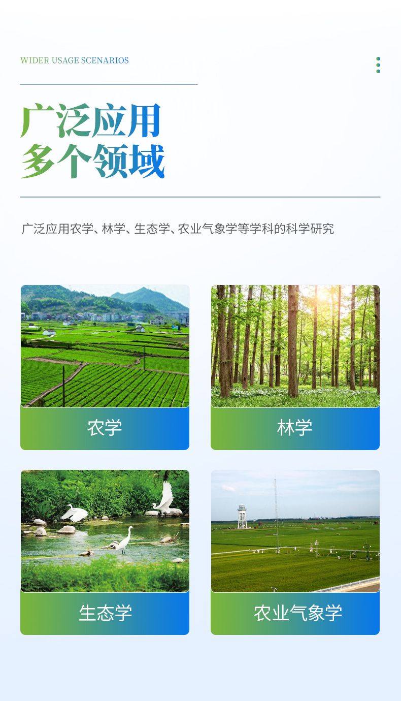 多功能:同時測定光合速率、蒸騰速率、胞間二氧化碳濃度、氣孔導度和水分利用效率,以及二氧化碳濃度、相對濕度、光合有效輻射和空氣溫度、葉片溫度十項指標