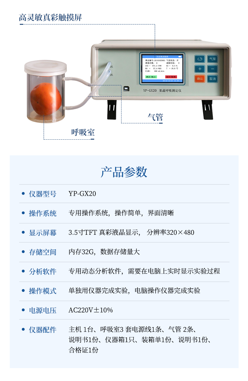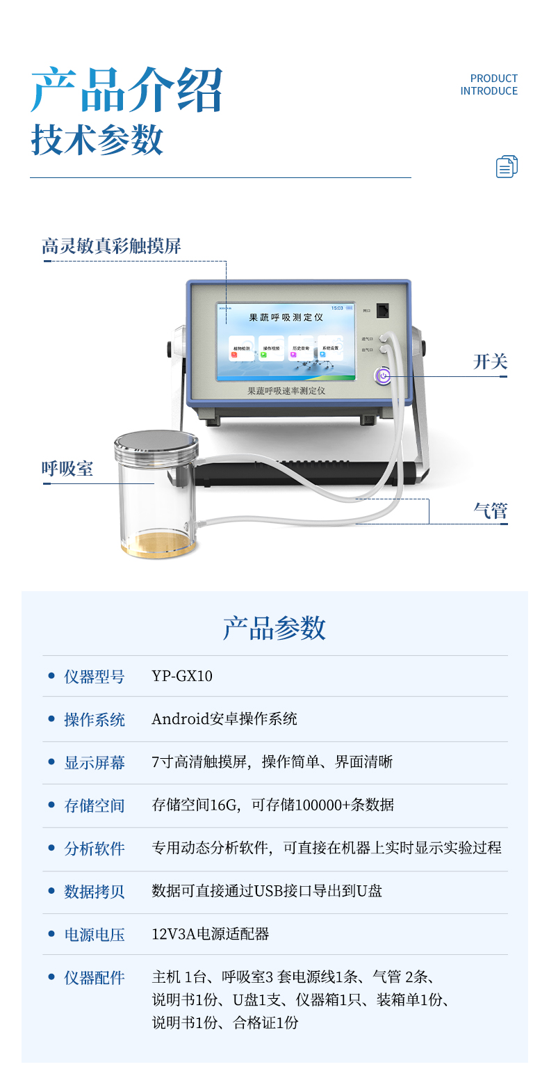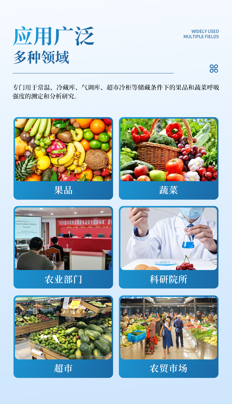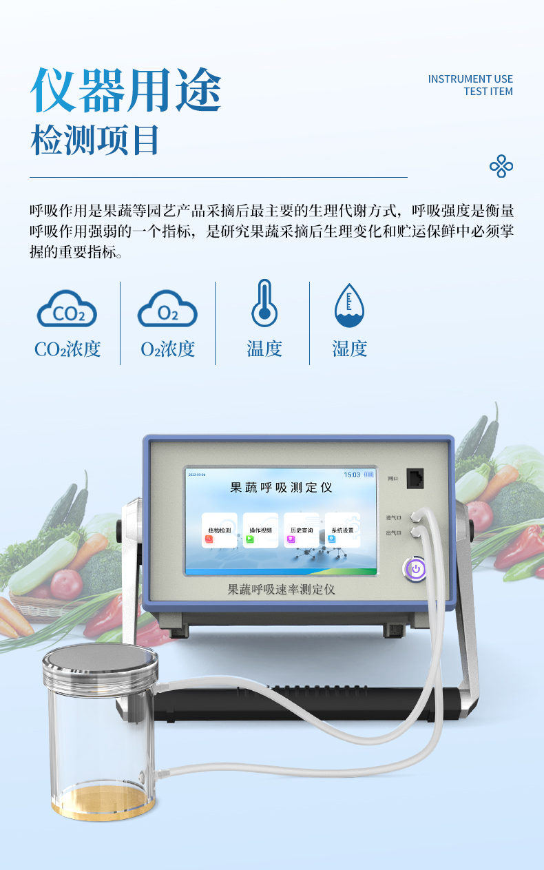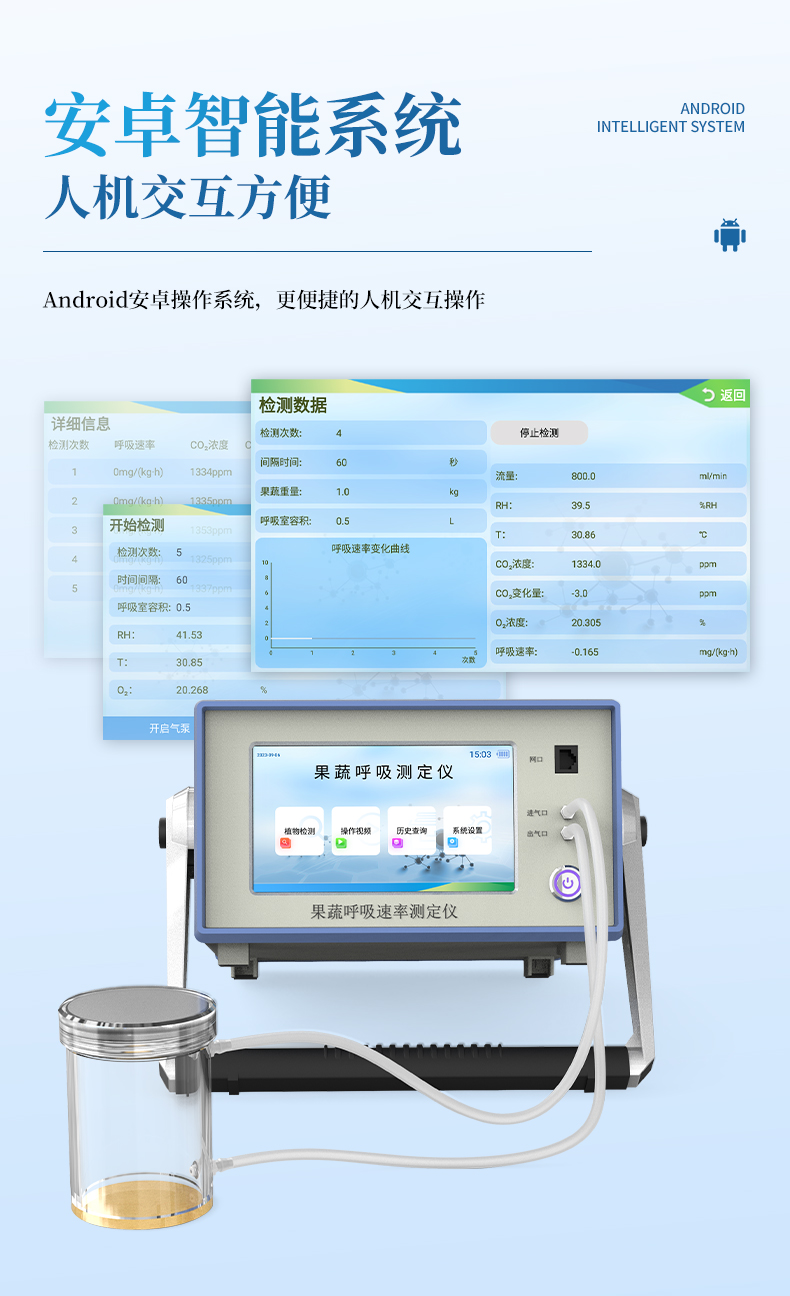 果蔬呼吸儀采用雙波長紅外二氧化碳分析器,7寸安卓顯示器,專門用于常溫、冷藏庫、氣調庫、超市冷柜等儲藏條件下的果品和蔬菜呼吸強度的測定和分析研究。