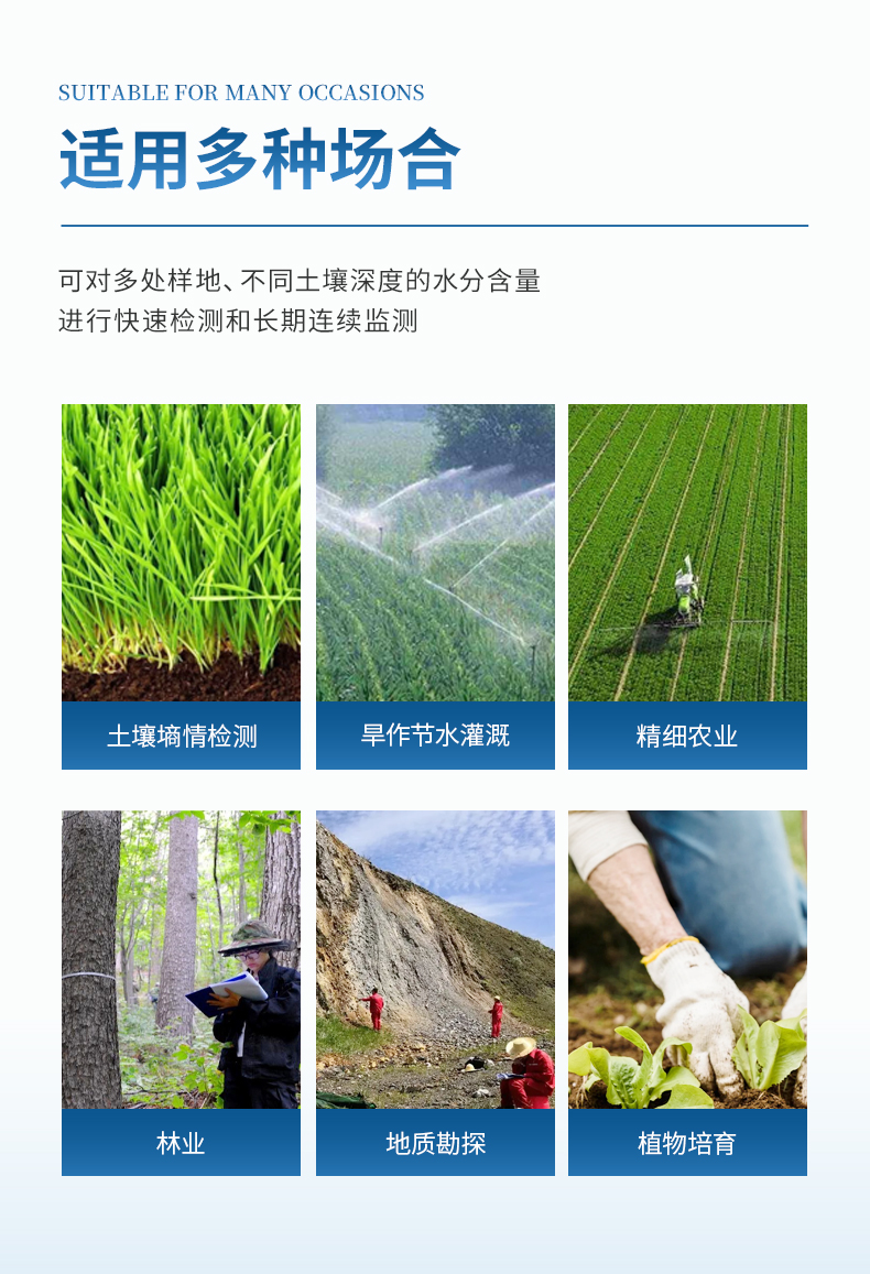 廣泛應(yīng)用于土壤墑情檢測、旱作節(jié)水灌溉、精細(xì)農(nóng)業(yè)、林業(yè)、地質(zhì)勘探、植物培育、水利、環(huán)保等領(lǐng)域。