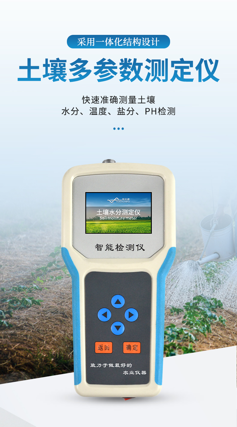 土壤水分溫度鹽分PH測定儀采用一體化結構設計,可快速準確測量土壤中含水量、溫度、電導率(鹽分)、酸堿度,可對多處樣地、不同土壤深度的水分含量溫度鹽分和PH進行快速檢測和長期連續監測。