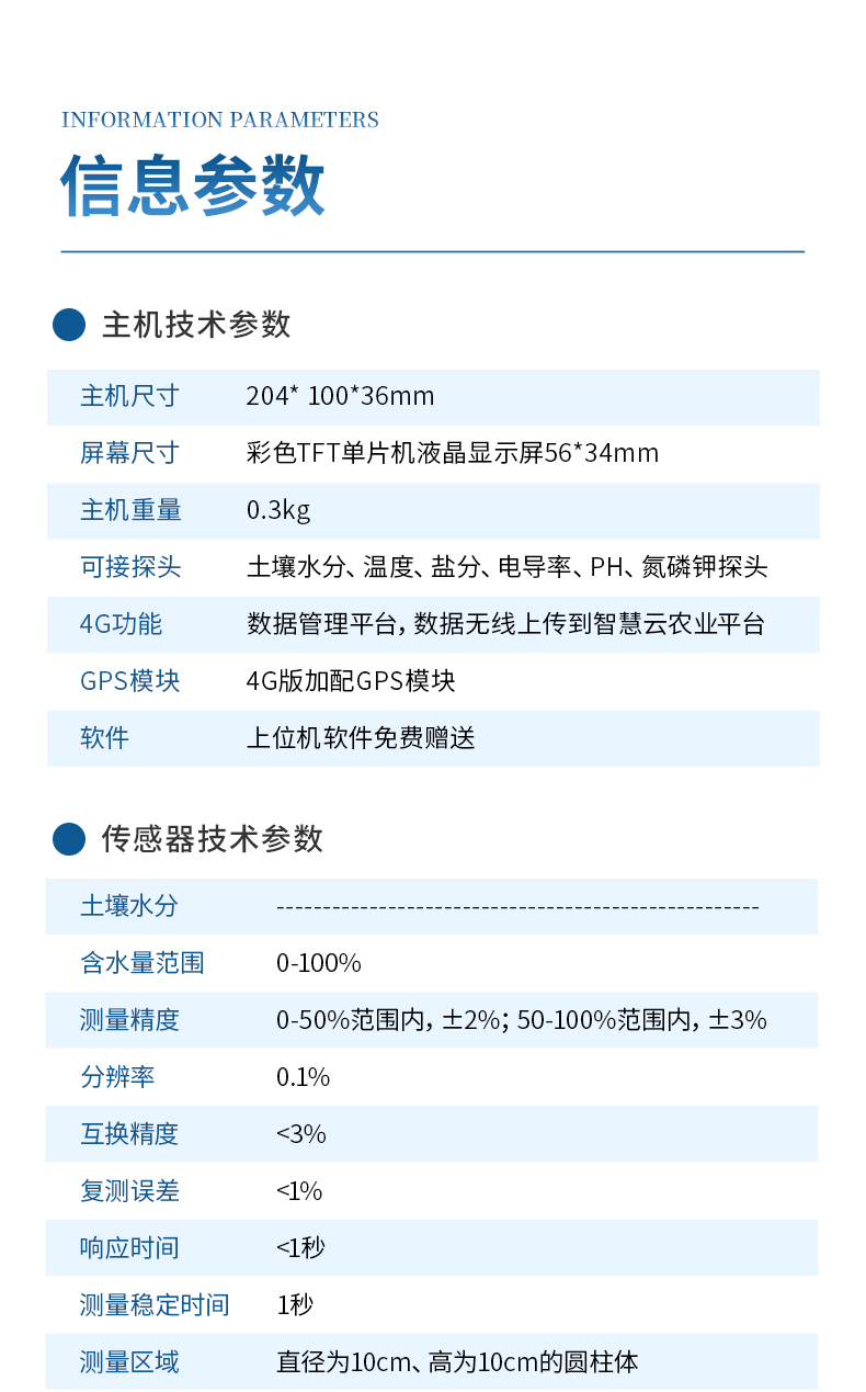 【產品簡介】檢測土壤容積含水量、溫度、鹽分、pH,配4G聯網功能