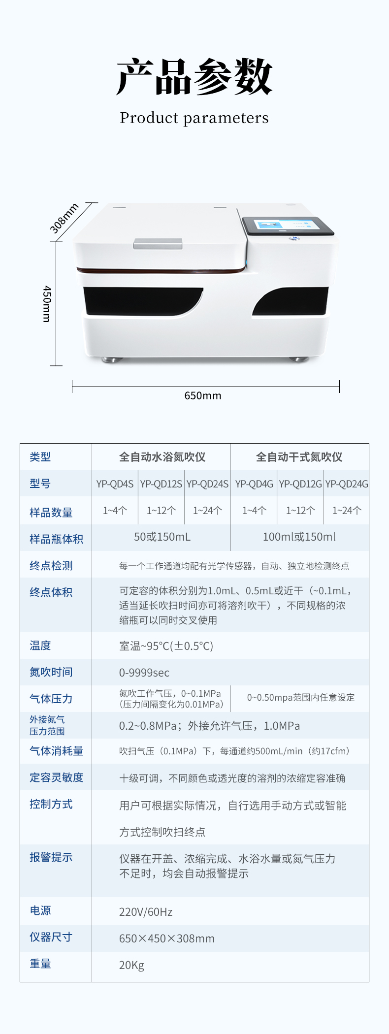 3、工作參數任意設置、控制和實時顯示:主要工作參數:氮吹壓力、水浴溫度和工作時間,均可按需設置。