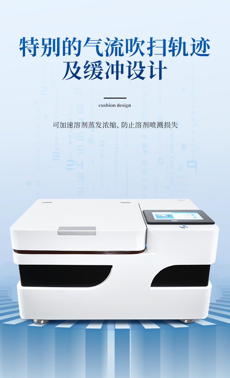 2、特別的氣流吹掃軌跡及緩沖設計:可加速溶劑蒸發濃縮、防止溶劑噴濺損失;