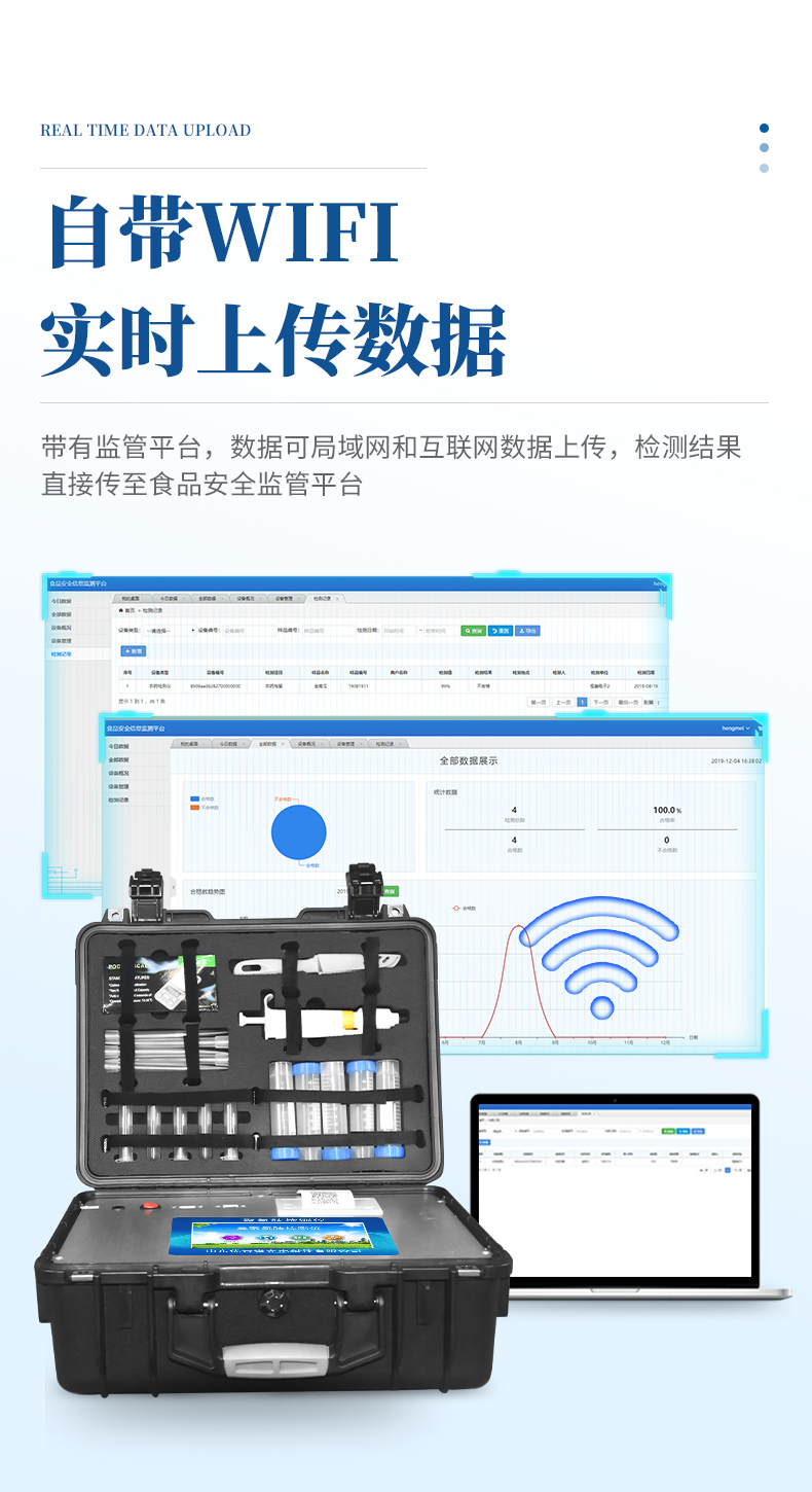 4、儀器帶有監(jiān)管平臺,數(shù)據(jù)可局域網(wǎng)和互聯(lián)網(wǎng)數(shù)據(jù)上傳,檢測結(jié)果直接傳至食品安全監(jiān)管平臺。進行區(qū)域食品安全監(jiān)管及大數(shù)據(jù)分析處理與數(shù)據(jù)統(tǒng)計,檢測區(qū)域食品安全長短期動態(tài),達到食品安全問題預(yù)估、預(yù)警