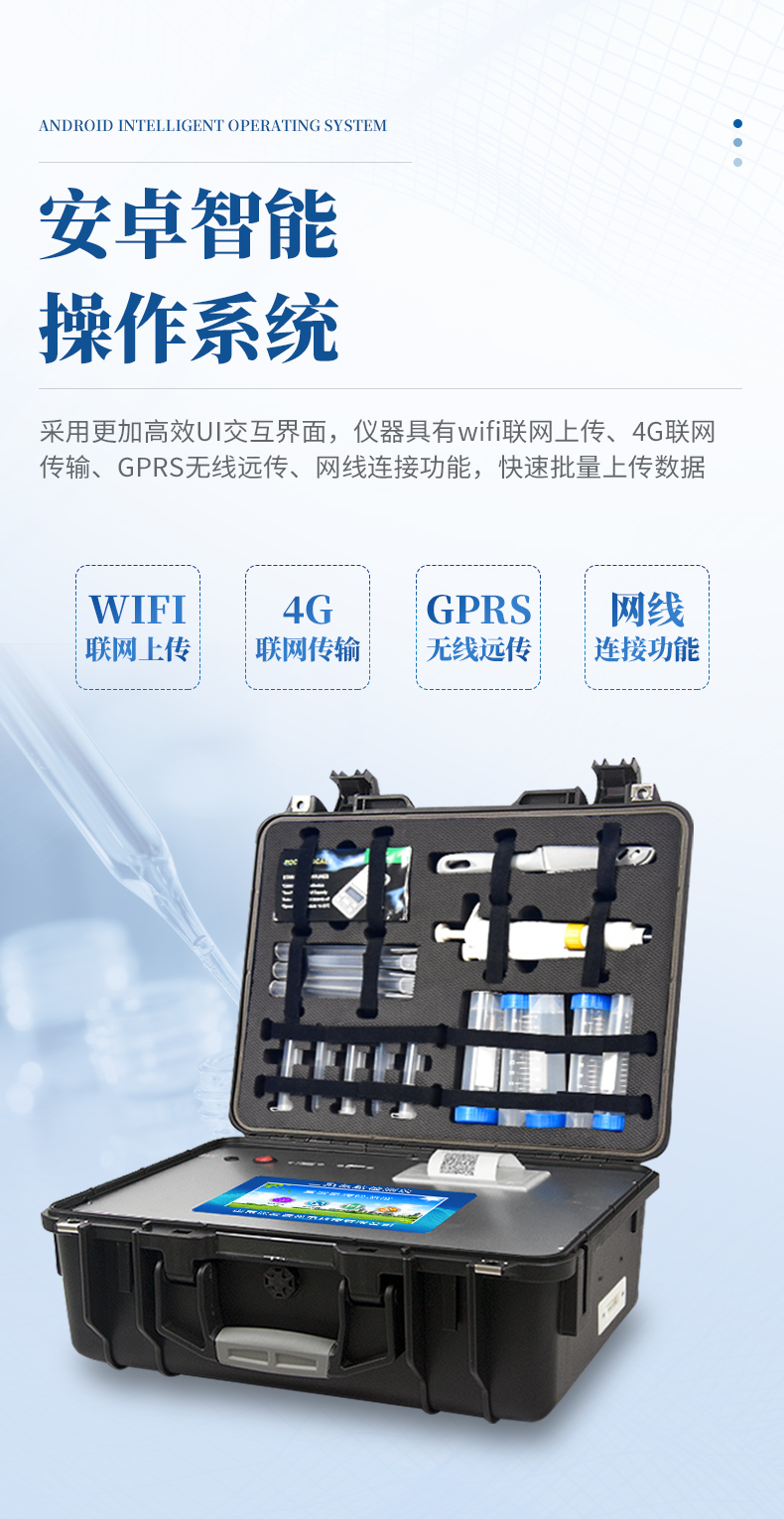 1、安卓智能操作系統(tǒng),采用更加高效和人性化操作,儀器具有wifi聯(lián)網(wǎng)上傳、4G聯(lián)網(wǎng)傳輸、GPRS無線遠傳、網(wǎng)線連接功能,快速上傳數(shù)據(jù)。