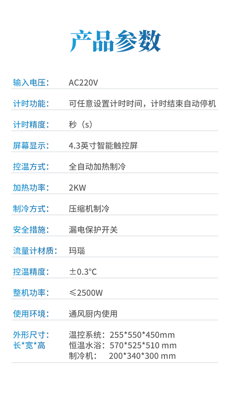 【產品簡介】控溫方式:全自動加熱制冷;加熱功率:2KW;控溫精度:±0.3℃