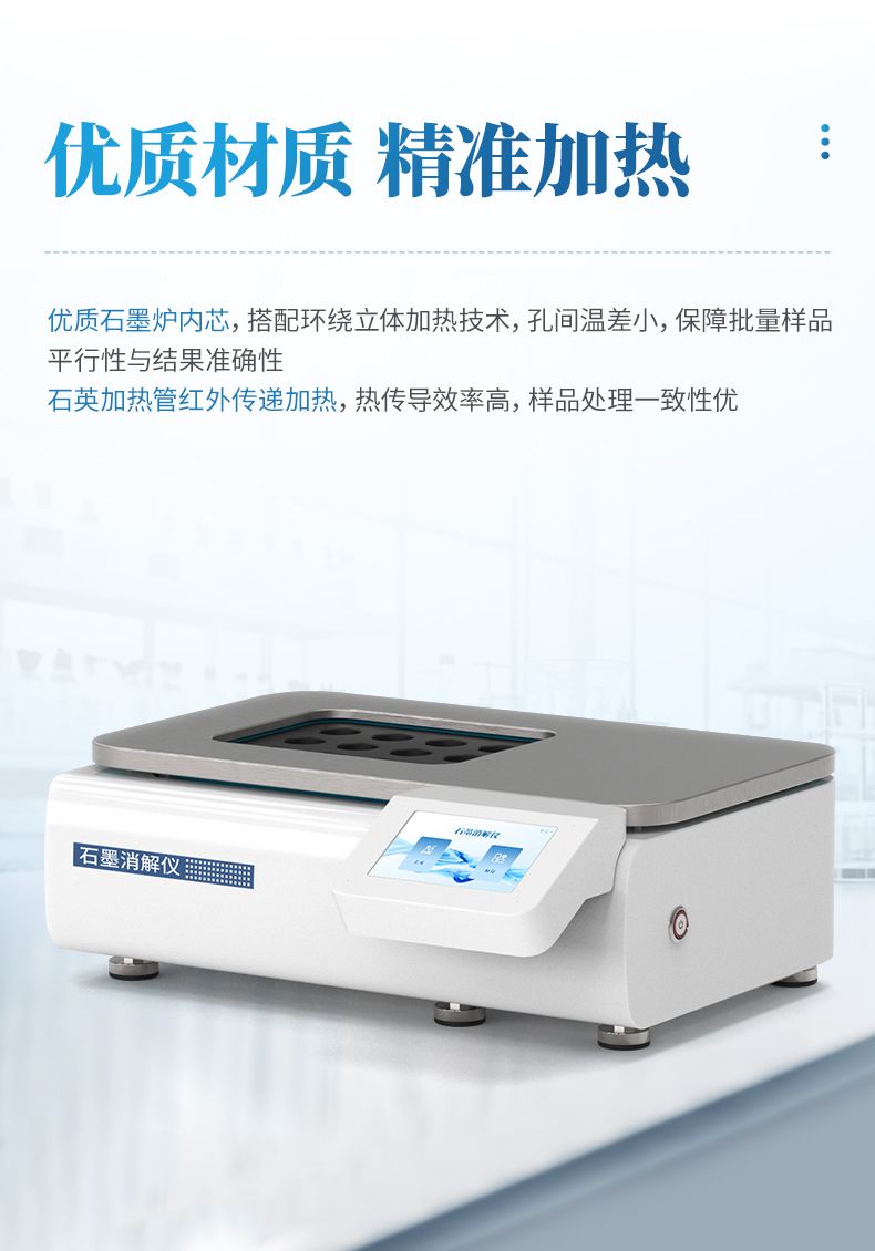 石墨消解儀采用優(yōu)質(zhì)高純石墨材質(zhì),結(jié)合精確的環(huán)繞立體加熱技術(shù),確保消解孔間溫差極小,有效保障了批量樣品處理的平行性與結(jié)果準(zhǔn)確性。智能PID溫控系統(tǒng)支持高精度程序升溫,用戶可靈活設(shè)定并存儲(chǔ)多組消解程序,操作簡(jiǎn)便,重現(xiàn)性極佳。同時(shí),儀器具備超溫保護(hù)、漏電保護(hù)等多重安全機(jī)制,配合耐腐蝕設(shè)計(jì)及友好的操作界面,在提升實(shí)驗(yàn)效率的同時(shí),全力守護(hù)實(shí)驗(yàn)安全。