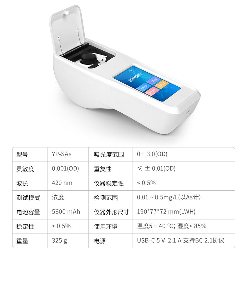 【產品簡介】手持式;檢測范圍:0.01 ~ 0.5mg/L(以As計);儀器重復性:< 0.5%;儀器穩定性:< 0.5%