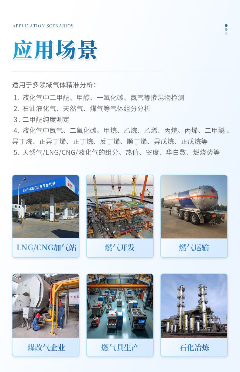 LPG LNG CNG加氣站、油田氣、煤層氣、礦井氣、頁巖氣、燃氣管道運輸公司、燃氣運輸公司、燃氣儲備站、煤改氣企業(yè)、LNG點供、燃氣具生產(chǎn)企業(yè)、石油煉化、焦化廠、冶煉廠和供氣站等眾多行業(yè)。