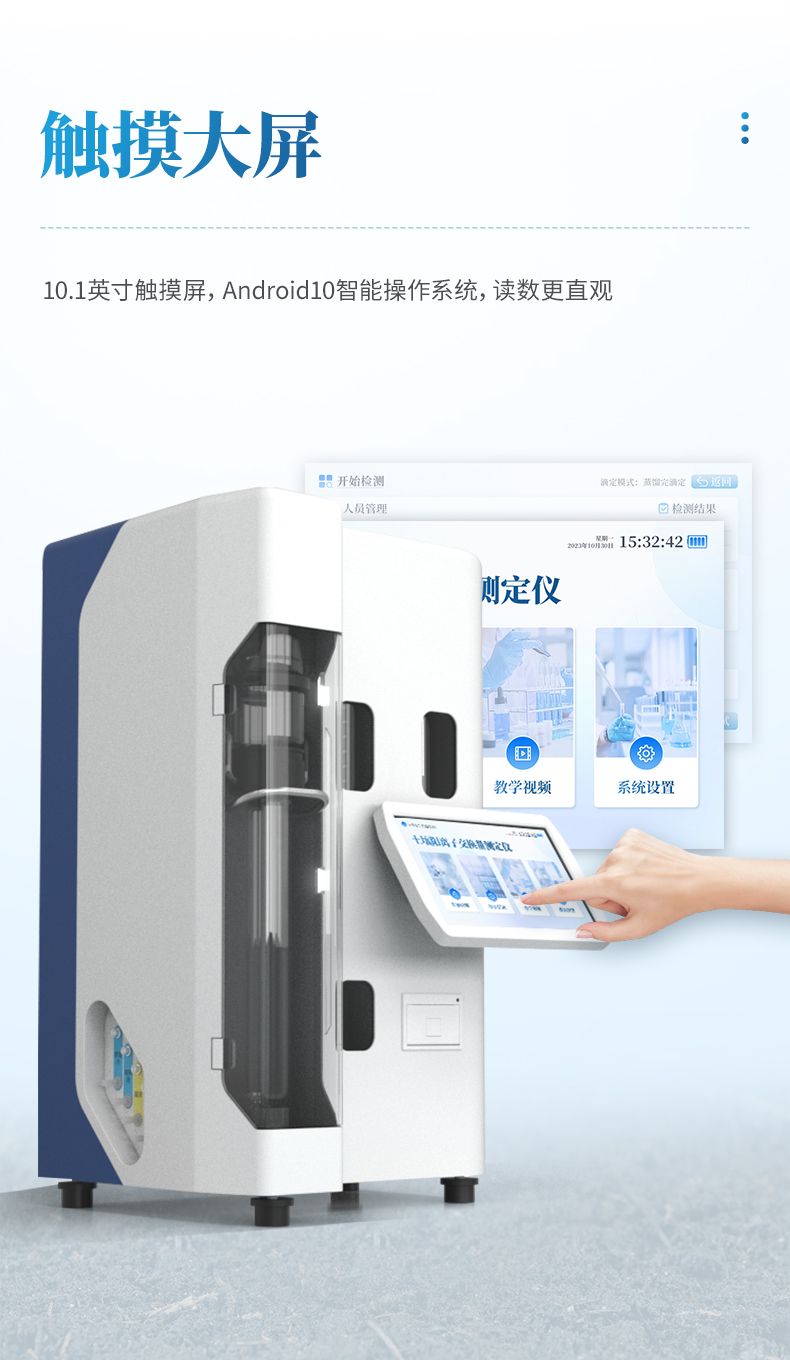 【產品簡介】動態滴定:邊蒸餾邊滴定;自動加液、蒸餾、吸收、滴定、排空、清洗;10寸屏;