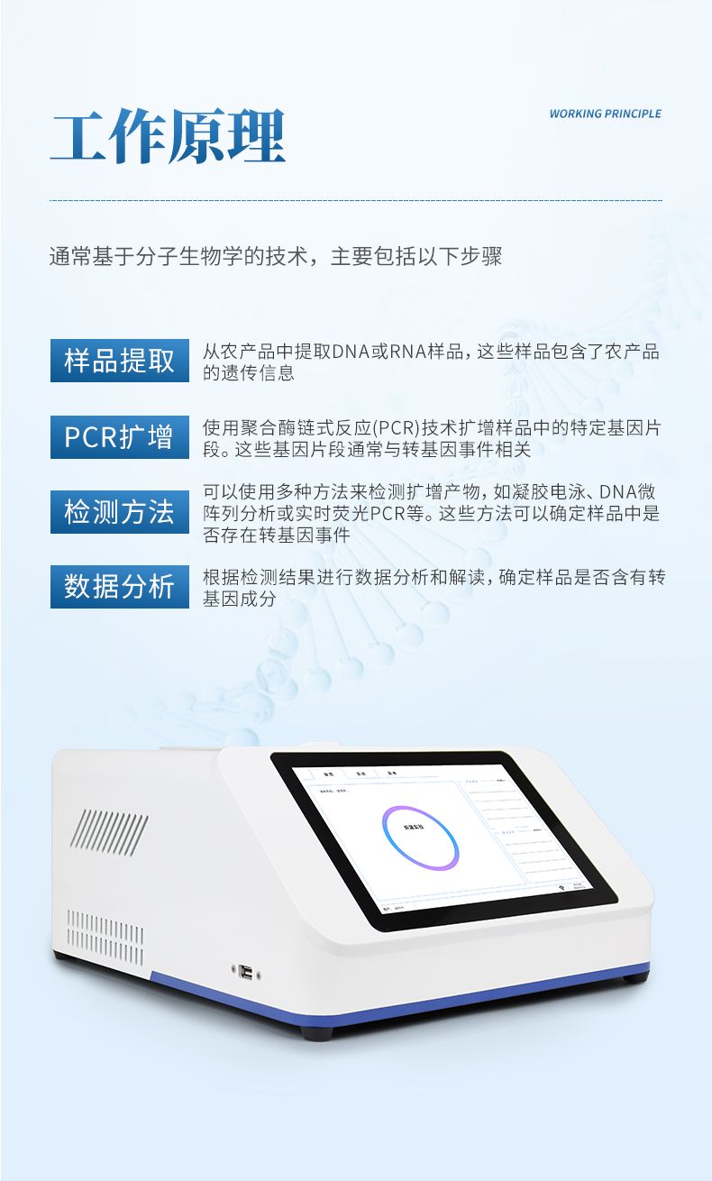 轉(zhuǎn)基因檢測(cè)儀的工作原理通常基于分子生物學(xué)的技術(shù),主要包括以下步驟: